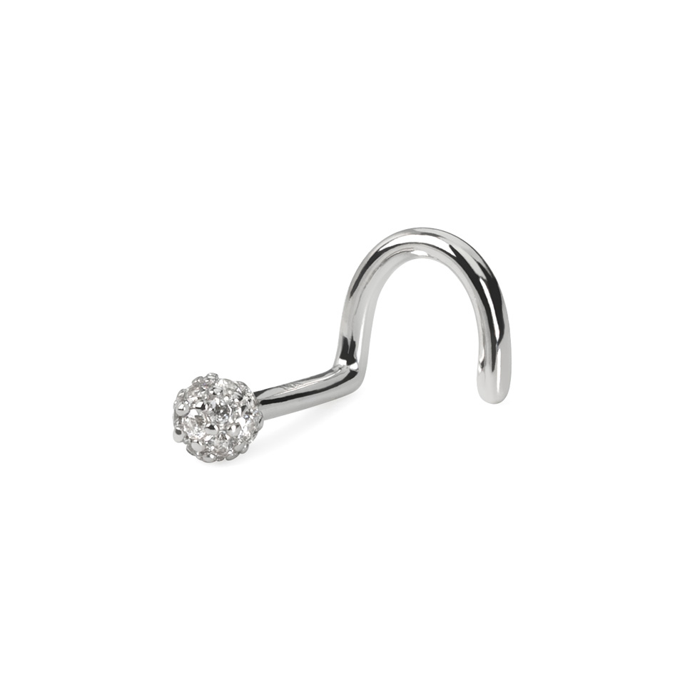 Etsitkö lävistykseesi kimallusta? Tämä korkealaatuinen käyrä nenäkoru sopii nenänsivuun tai korvalävistyksiin. 3 mm:n pallo on vuorattu kimaltavilla CZ-kivillä. Koru on valmistettu 14k kullasta, vaihtoehtoina kelta- tai valkokulta.