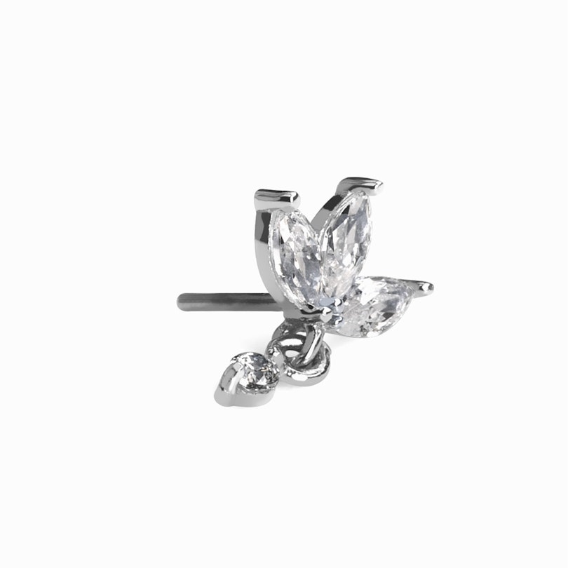 Tässä loisteliaassa 14K kultaisessa push-in yläosassa on kolme markiisileikattua zirkoniakiveä kruunuistutuksella, jotka muodostavat lotuskukan muodon, sekä pyöreä kruunuistutettu korukiviriipus, joka roikkuu kukan keskeltä.