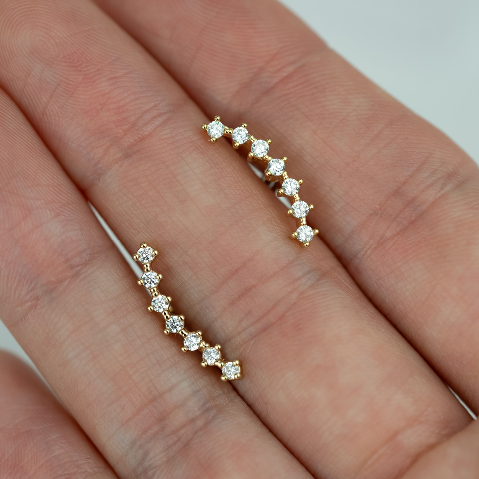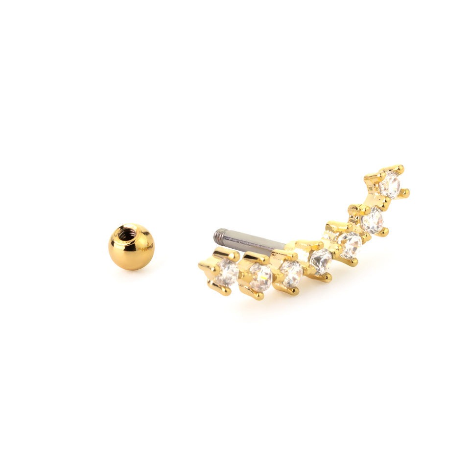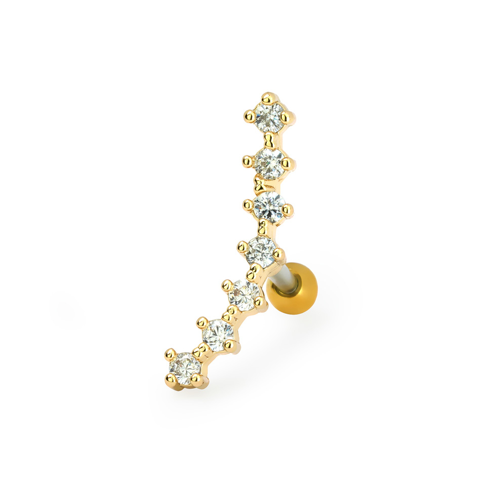 Upeat korvakorut täydentävät minkä tahansa lookin, ja jos tarvitset jotain näyttävämpää, tämä on oikea koru sinulle. Barbellin kaareva koriste kimaltelee kuin tähtirivi yötaivaalla. Koru herättää tarpeeksi huomiota yksinäänkin, mutta se sopii myös täydellisesti useampien korujen yhdistelmään. Voit esimerkiksi käyttää korua helix-, conch- tai korvalehden lävistyksessä. Kokeile sitä vapaasti eri lävistyksiin ja erilaisiin yhdistelmiin.