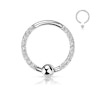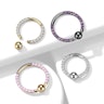 Näin elegantti koristelu captive bead -renkaassa on harvinaista. Kimaltelevat CZ-kivet renkaan kummallakin puolella tekevät korusta näyttävän. Hyvät uutiset eivät myöskään lopu tähän; koru on tehty G23-luokan titaanista, eli saat varmasti parasta laatua lävistykseesi. Hypoallergeeninen titaani on turvallinen materiaali kaikille ihotyypeille, joten mielenrauha on taattu. Renkaan paksuus on 1,2 mm ja halkaisija 8 tai 10 mm. Voit valita pinnan väriksi klassisen kullan tai hopean, romanttisen ruusukullan tai mystisen mustan. Myös korukivien väri vaihtelee pintavärin mukaan.