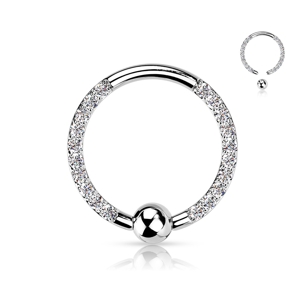 Näin elegantti koristelu captive bead -renkaassa on harvinaista. Kimaltelevat CZ-kivet renkaan kummallakin puolella tekevät korusta näyttävän. Hyvät uutiset eivät myöskään lopu tähän; koru on tehty G23-luokan titaanista, eli saat varmasti parasta laatua lävistykseesi. Hypoallergeeninen titaani on turvallinen materiaali kaikille ihotyypeille, joten mielenrauha on taattu. Renkaan paksuus on 1,2 mm ja halkaisija 8 tai 10 mm. Voit valita pinnan väriksi klassisen kullan tai hopean, romanttisen ruusukullan tai mystisen mustan. Myös korukivien väri vaihtelee pintavärin mukaan.