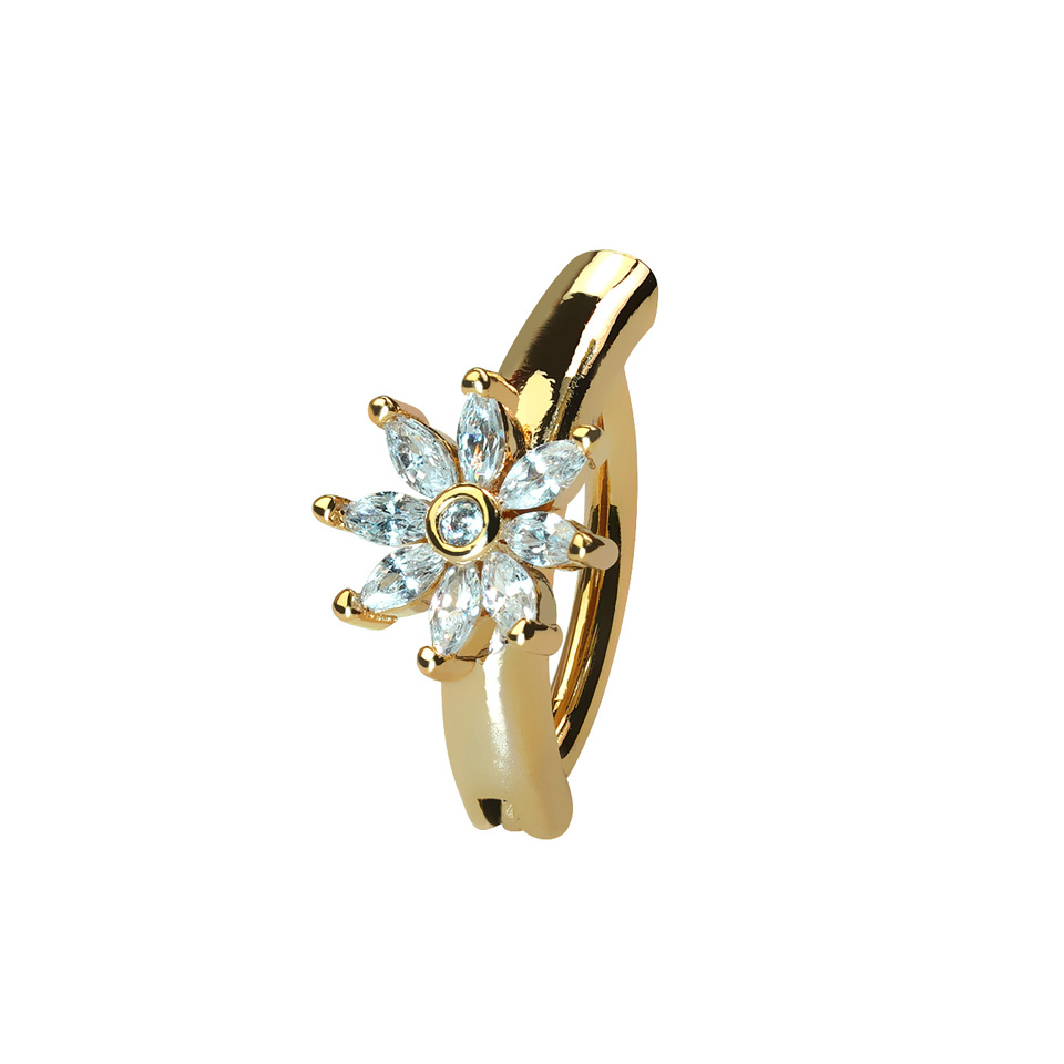 Tässä tyylikkäässä clicker-napakorussa on kimaltava kukka sen keskiössä. Kukka on tehty yhdekästä zirkoniakivestä.