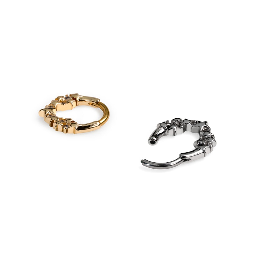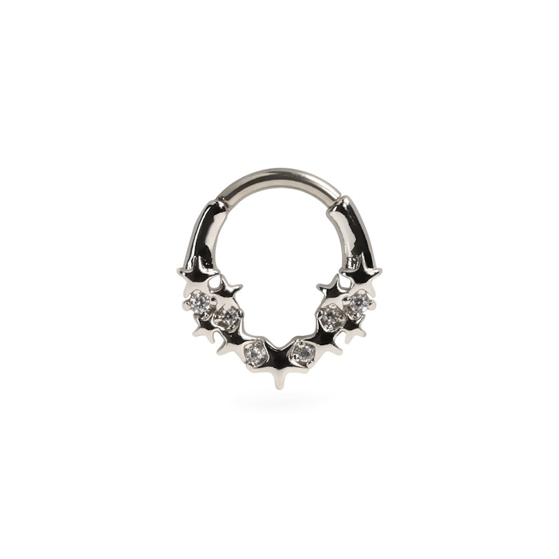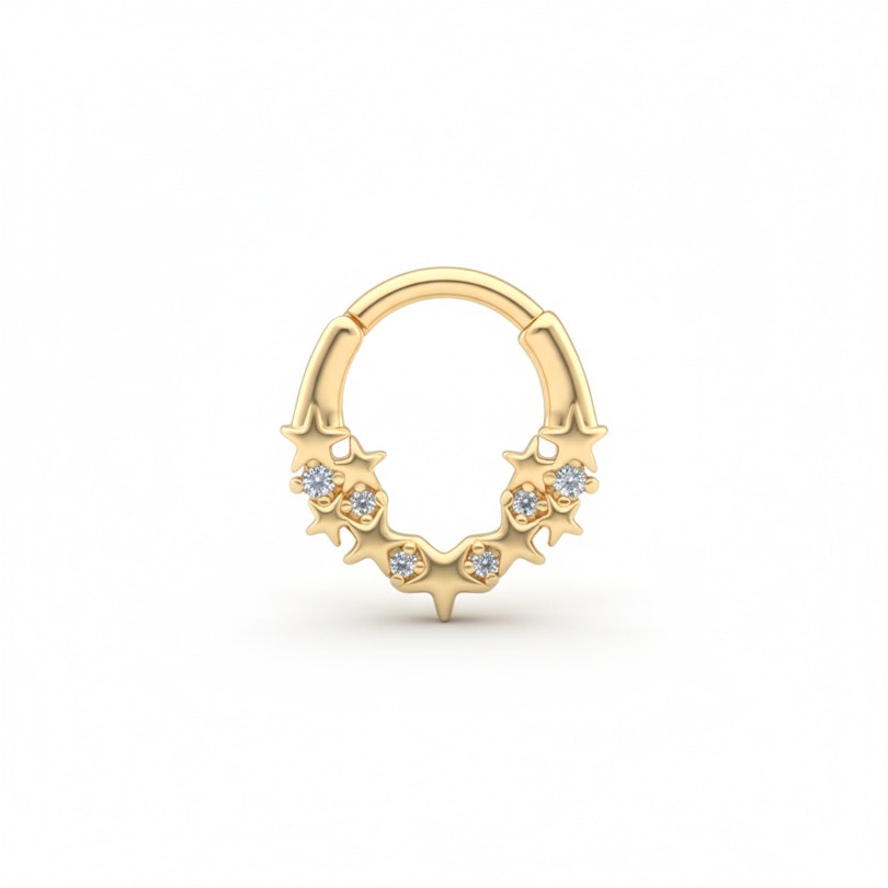 Tämä eteenpäin suunnattu rengas tähdillä ja kuunsirpeillä on erinomainen lisä kokoelmaasi. Sen saranallinen lukitusmekanismi tekee siitä helpon asetettavan ja varmistettavan lävistykseesi.