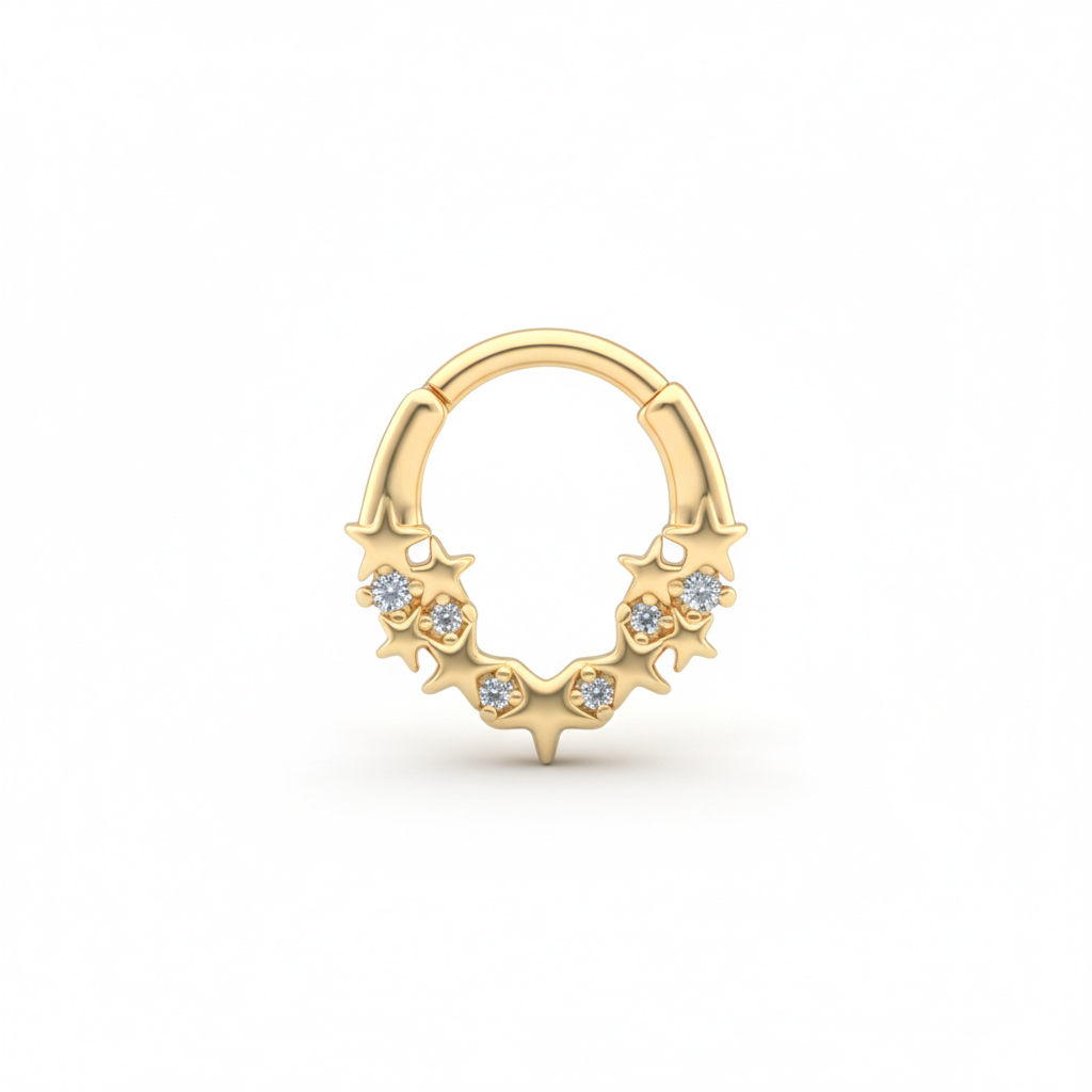 Tämä eteenpäin suunnattu rengas tähdillä ja kuunsirpeillä on erinomainen lisä kokoelmaasi. Sen saranallinen lukitusmekanismi tekee siitä helpon asetettavan ja varmistettavan lävistykseesi.