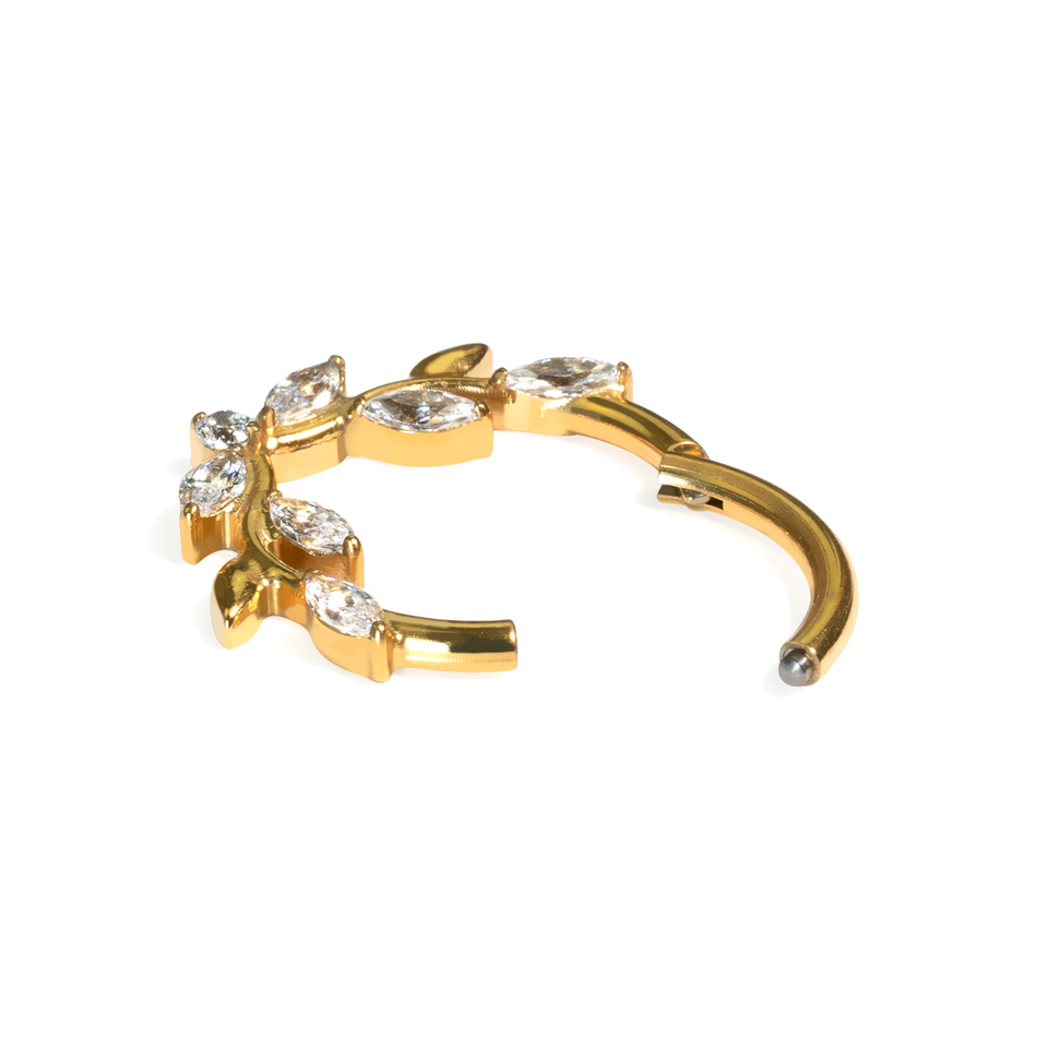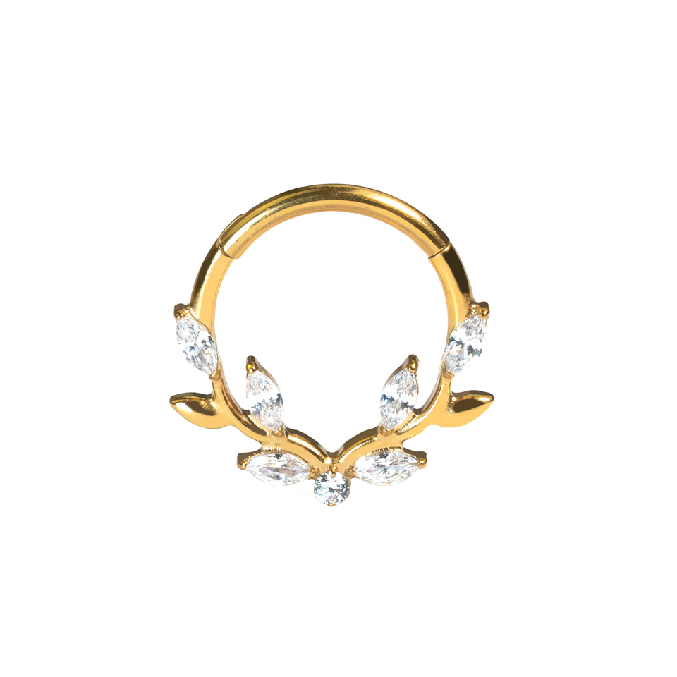 Tämä laadukas eteenpäin suunnattu clicker-rengas kauniilla köynnöslehdillä näyttää erityisen upealta daithin ja septumin kaltaisissa lävistyksissä.