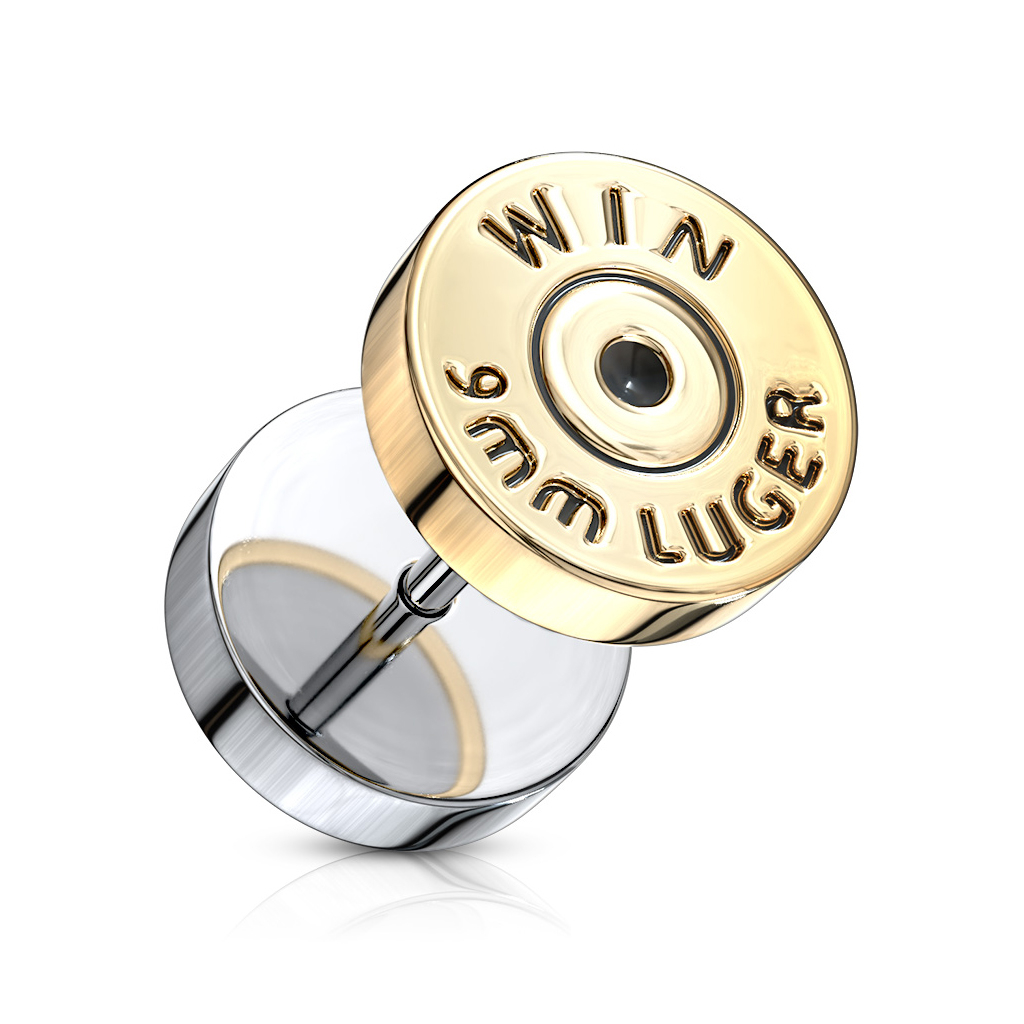 Tämä fake-plugi näyttää patruunan takaosalta. Fake-plugi tarkoittaa sitä, että kyseessä on venytyskoru, jota voi käyttää normaalissa 1,2 mm:n lävistyksessä. Ero tämän ja 10 mm:n plugin välillä ei ole havaittavissa, kun koru on korvalehdessä.