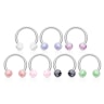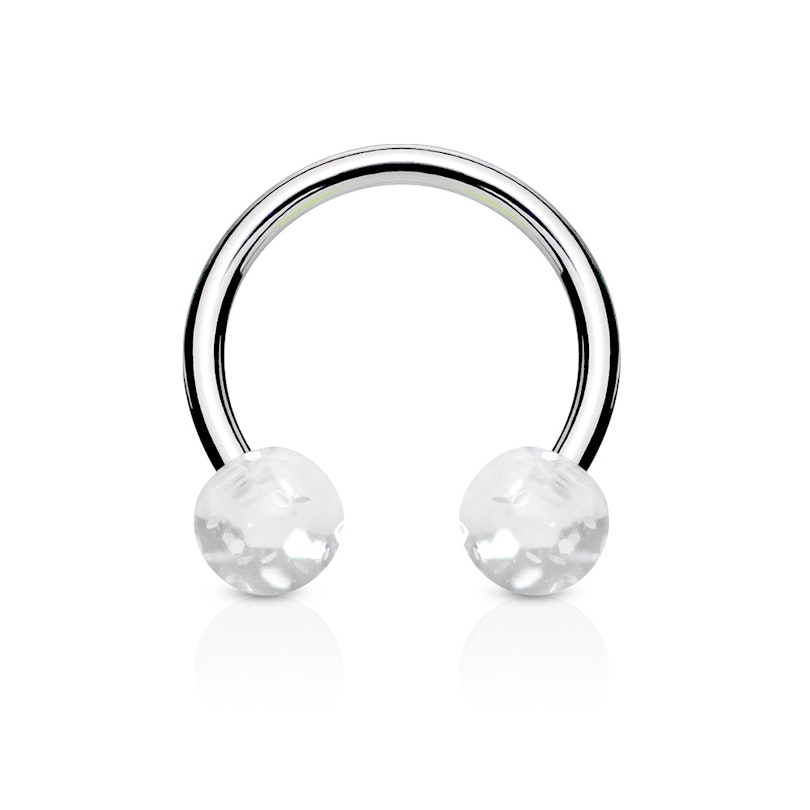 Hevosenkenkä glitteripalloilla, jonka värin voit itse valita. Löydät valikoimasta kaikki klassiset värit mutta myös punaisen, sinisen sekä esimerkiksi vihreän. Hevosenkenkä on koristeltu kahdella akryylipallolla, jotka kimaltelevat. Korua voidaan käyttää myös muihin lävistyksiin, kunhan lävistyksesi mitat ovat samat kuin korun.