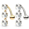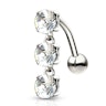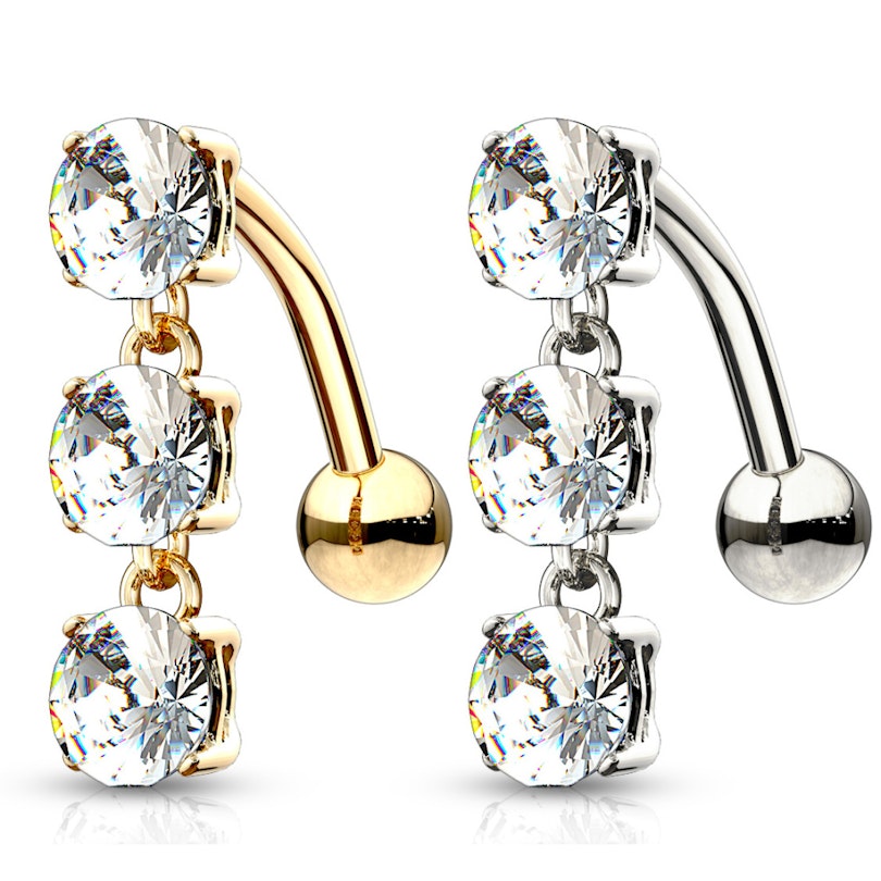 Erikoinen nurinkurinen design erottaa tämän korun joukosta, kun tavallinen napakorun riipus kiinnittyy korun alaosaan, tämä riipus alkaa korun yläosasta roikkuen navan edessä. Elegantti koru muodostuu kolmen jalokiven riipuksesta, alaosan palloon on myös upotettu kirkas kivi (ei näkyvillä kuvassa). Korun muodon vuoksi se laitetaan paikalleen napalävistyksen yläpuolelta. Tämä uniikki koru on valmistettu 14k kullasta.