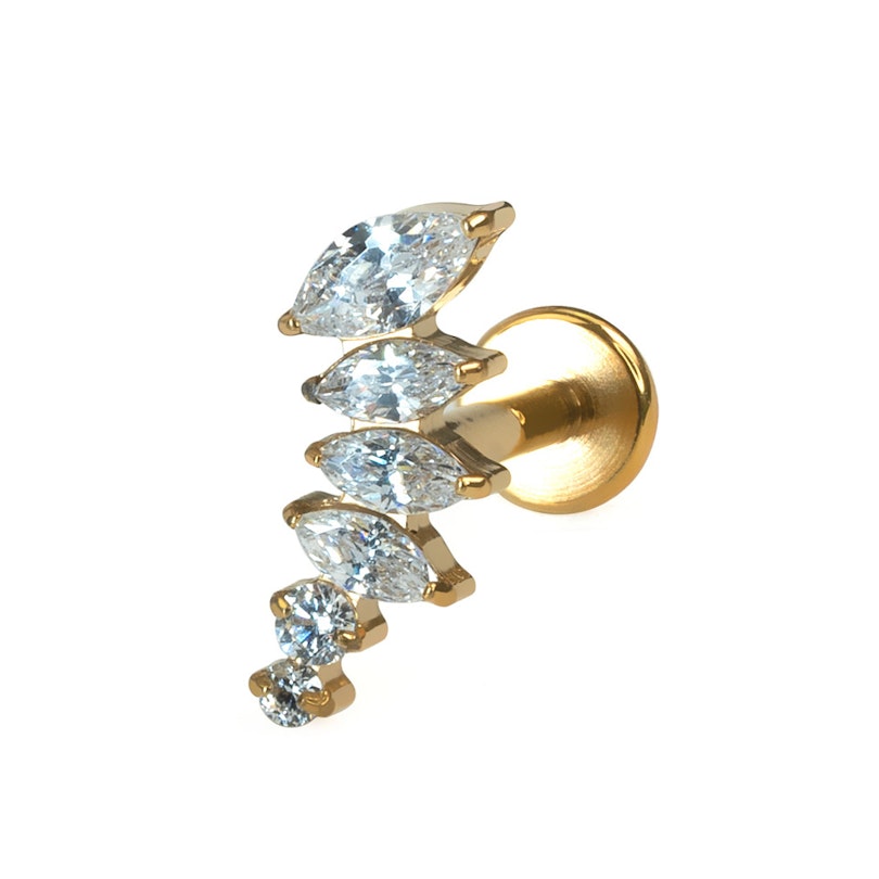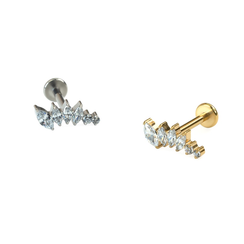 Tässä labretissa on markiisihiotut zirkoniakivet, jotka pienenevät toinen toisensa jälkeen. Kivet ovat asetettu hellään kaareen, mikä tekee siitä ihanteellisen pidettävän korvan muotoa mukaileviin lävistyskohteisiin, kuten helix, flat ja korvalehden yläosa.