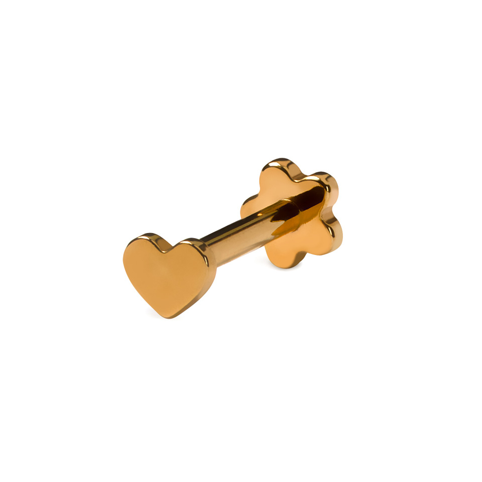 Ei ole olemassa huonoja kulmia tämän kaksipuoleisen titaanilabretin kanssa, jota koristaa kukka ja sydän. Sydän on korun push-in yläosa ja kukka toimii korun alaosana. Titaanimateriaalinsa ansiosta se on sekä hypoallergeeninen että vedenkestävä, joten voit pitää sitä vaivattomasti koko päivän.
