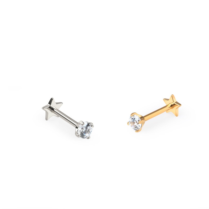 Tämä kaksipuolinen titaanilabret tähden muotoisella takaosalla sopii täydellisesti esimerkiksi helix- tai korvalehtilävistyksiin, joissa korun takaosa jää näkyviin.
