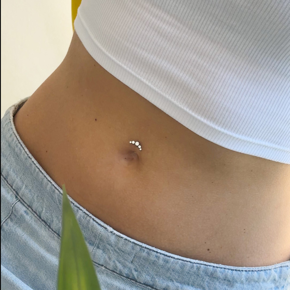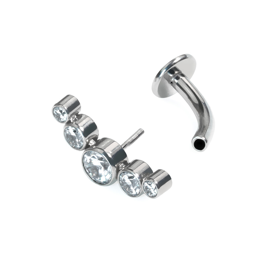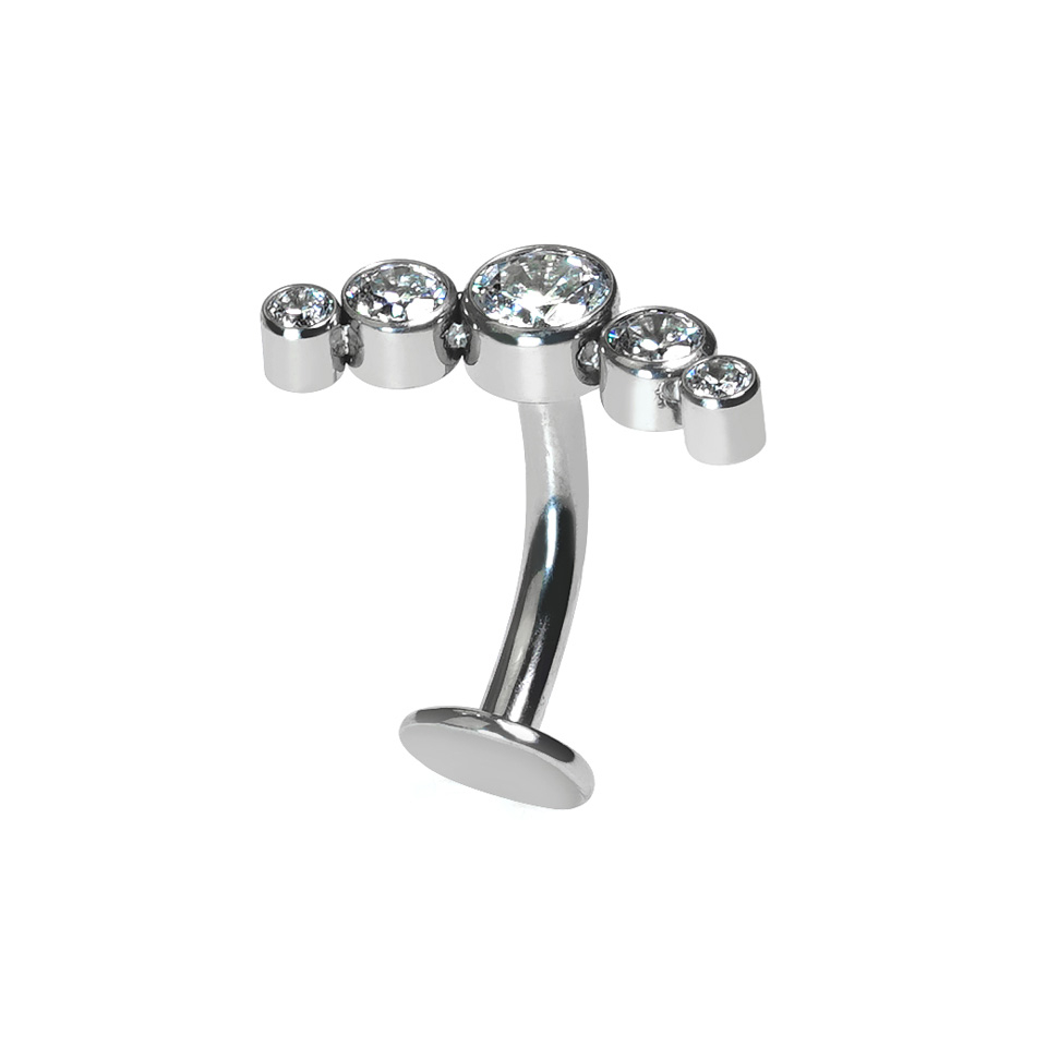 Tässä kelluvassa titaaninapakorussa on viisi tynnyri-istutettua kristallia. Titaanimateriaalinsa ansiosta koru on hypoallergeeninen ja vedenkestävä.