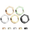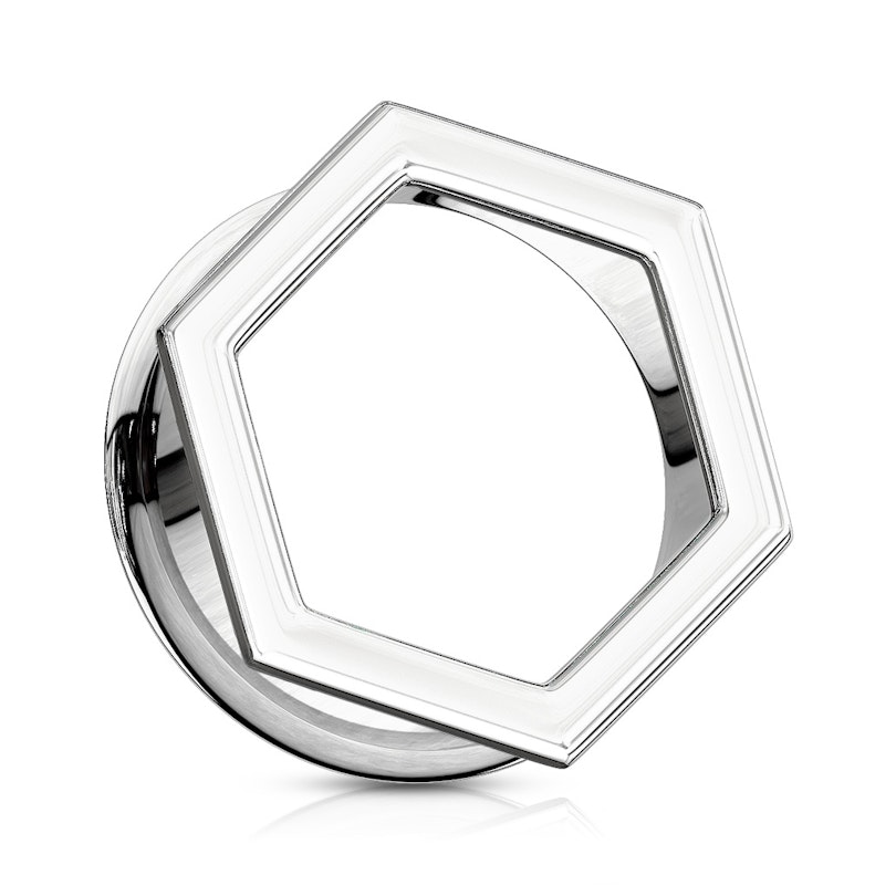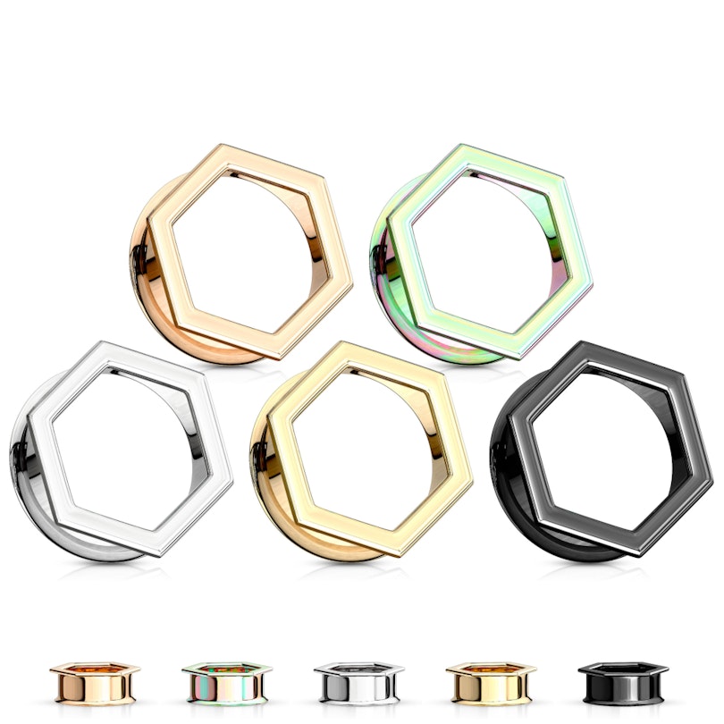 Tämä kuusikulmainen tunneli on valmistettu kiruginteräksestä. Koru on pyöreä mutta näkyvä osa on kuitenkin kuusikulmainen, joten ei, et joudu tunkemaan kuusikulmaista korua pyöreään korvalävistykseen. Korua voidaan kutsua myös "Double flared tunnel" mikä tarkoittaa edellä mainittua ominaisuutta.