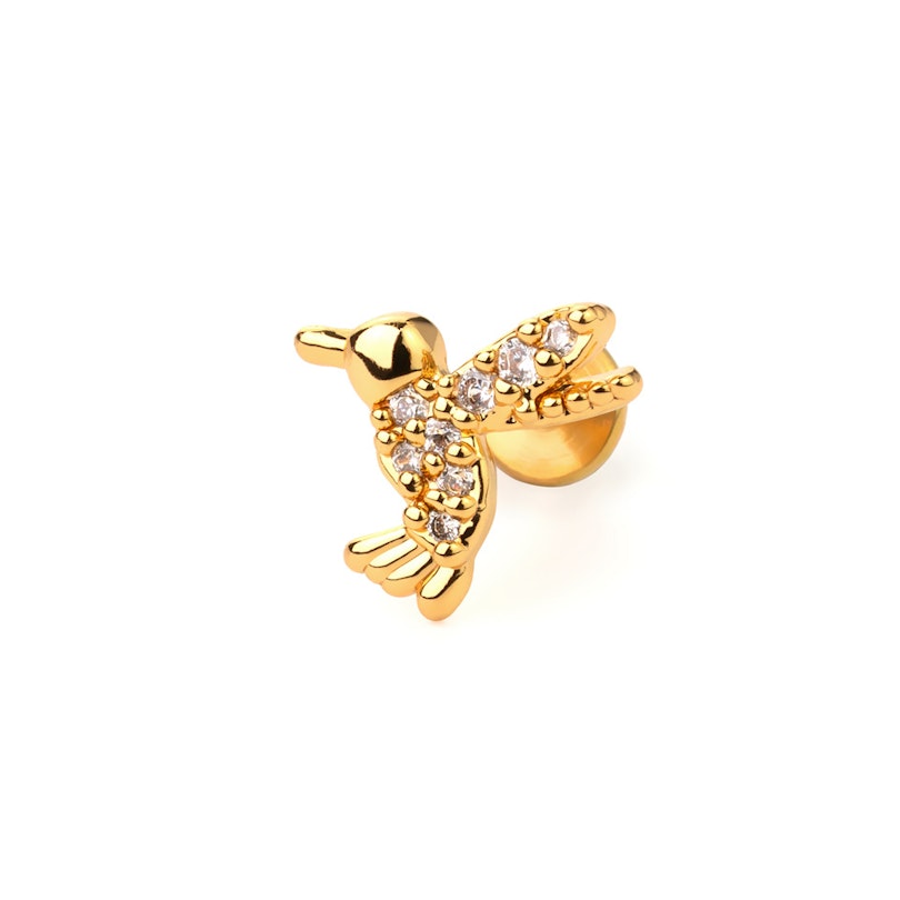 Kaikista maailman kauniista eläimistä kolibri kuuluu inspiroivimpiin. Se on ketterä, älykäs, voimakas ja tunnettu kyvystää leijua ilmassa paikallaan. Tämän labretin muotoilu tuo tyylisi todella eloon, ja se sopisi myös täydellisesti lahjaksi läheiselle ihmiselle. Linnun höyhenpeitettä edustaa upea kimaltava kivirypäs, mikä tekee siitä entistäkin huomiota herättävän.