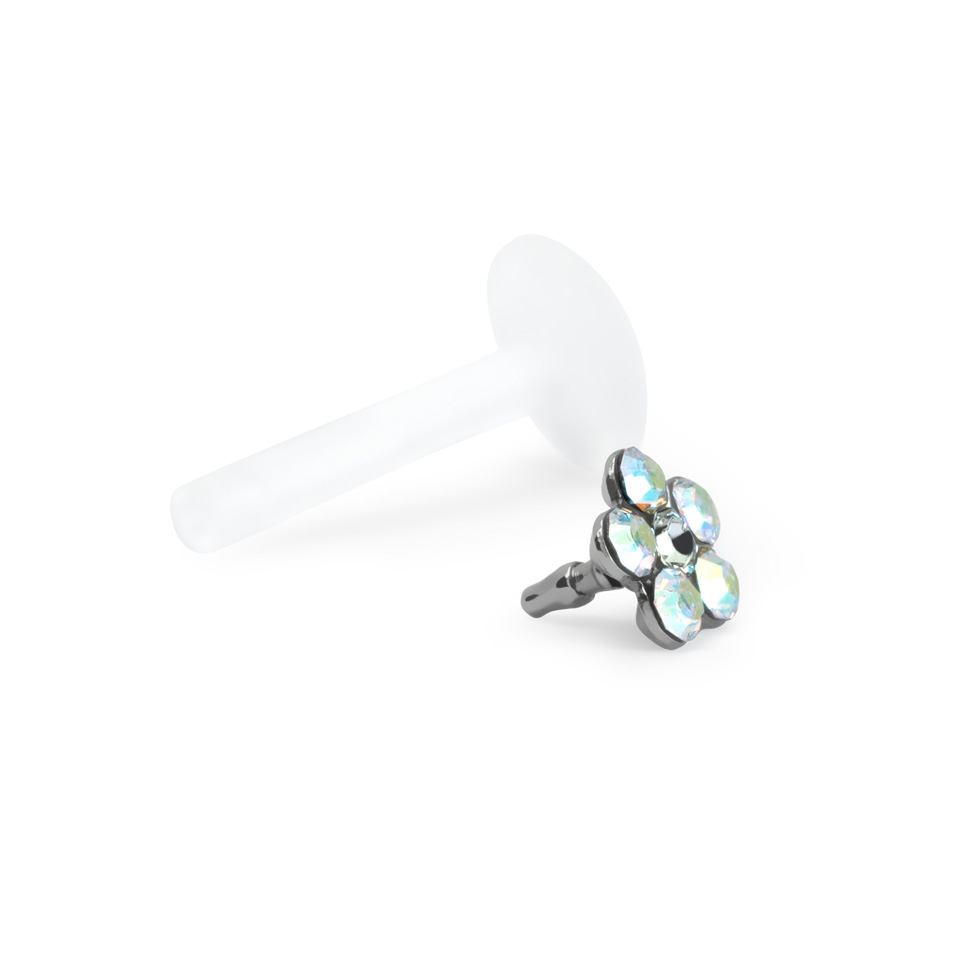 Upea labret kukan muotoisella designilla. Tämä koru eroaa tavallisista labreteista siinä suhteessa, että siinä on kuusi kimaltelevaa jalokiveä.