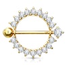 Puuttuuko sinulta upea nännikoru lävistykseesi? Nyt sinulla on mahdollisuus hankkia upea nännikilpi 14 karaatin kullasta upeilla jalokivillä. Koru näyttää pieneltä auringolta, jossa on säteileviä jalokiviä ympärillä. Korun pallo on 4 mm. pallo kullasta ilman mitään jalokiveä, kun taas korun toisella puolella koristaa upea pyöreä jalokivi, joka on hieman suurempi kuin muut jalokivet. Pyöreällä jalokivellä on myös korussa tehtävä. Lukituspallo on helpompi kiertää pois, kun voit ottaa kiinni toisesta päästä, jossa tämä pyöreä jalokivi siis sijaitsee. Tämä koru hieman kokeneemmille lävistäjille ja se on aivan pakko hankkia, jos haluat lävistyksellesi vain parasta. Tilaa itsellesi tai jollekin lahjaksi!