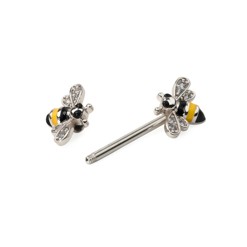 Meillä on mitä kaunein koru yksilöllistä nännikoristetta etsivälle. Tämä suora barbelli on 14 mm pitkä, mutta käytössä oleva pituus vaihtelee mehiläisten välisen etäisyyden mukaan.