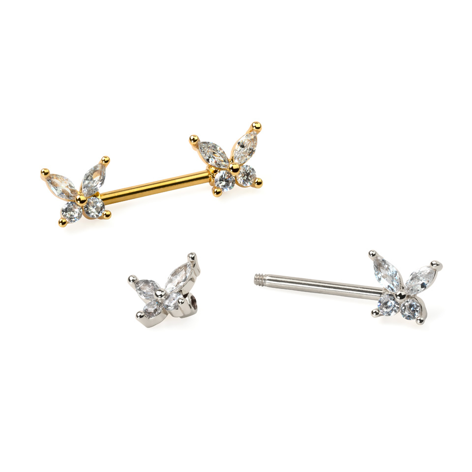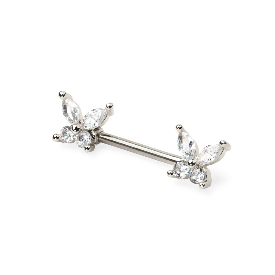Tämä näyttävän ylellinen koru on ehdoton lisä muodikkaaseen korukokoelmaasi. Perhosten zirkonia-siivet tuovat hienostuneen ilmeen herttaiseen nännilävistyskoruun.