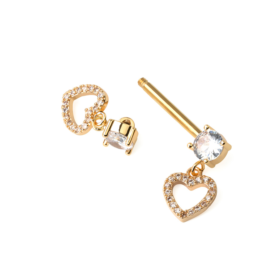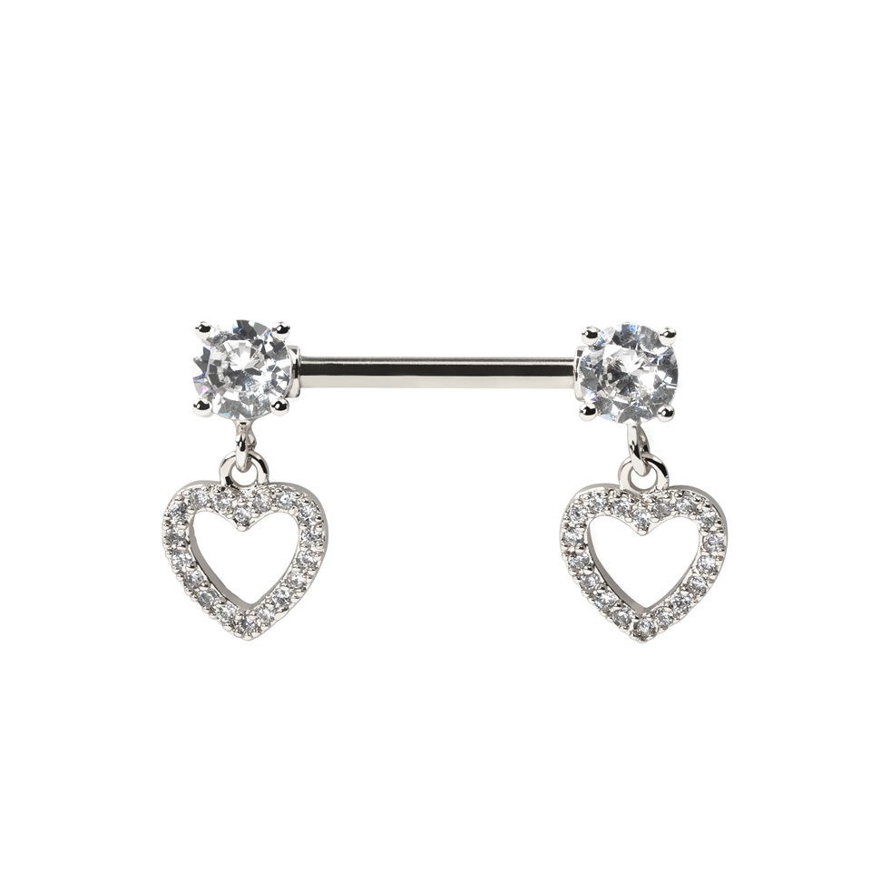 Tätä kaunista nännikorua koristaa zirkoniakivi molemmissa päissä, joihin kiinnittyy ihanat sydänriipukset useammilla pienillä zirkoniakivillä.