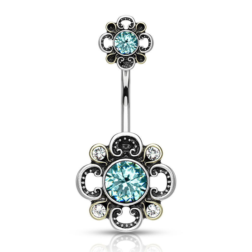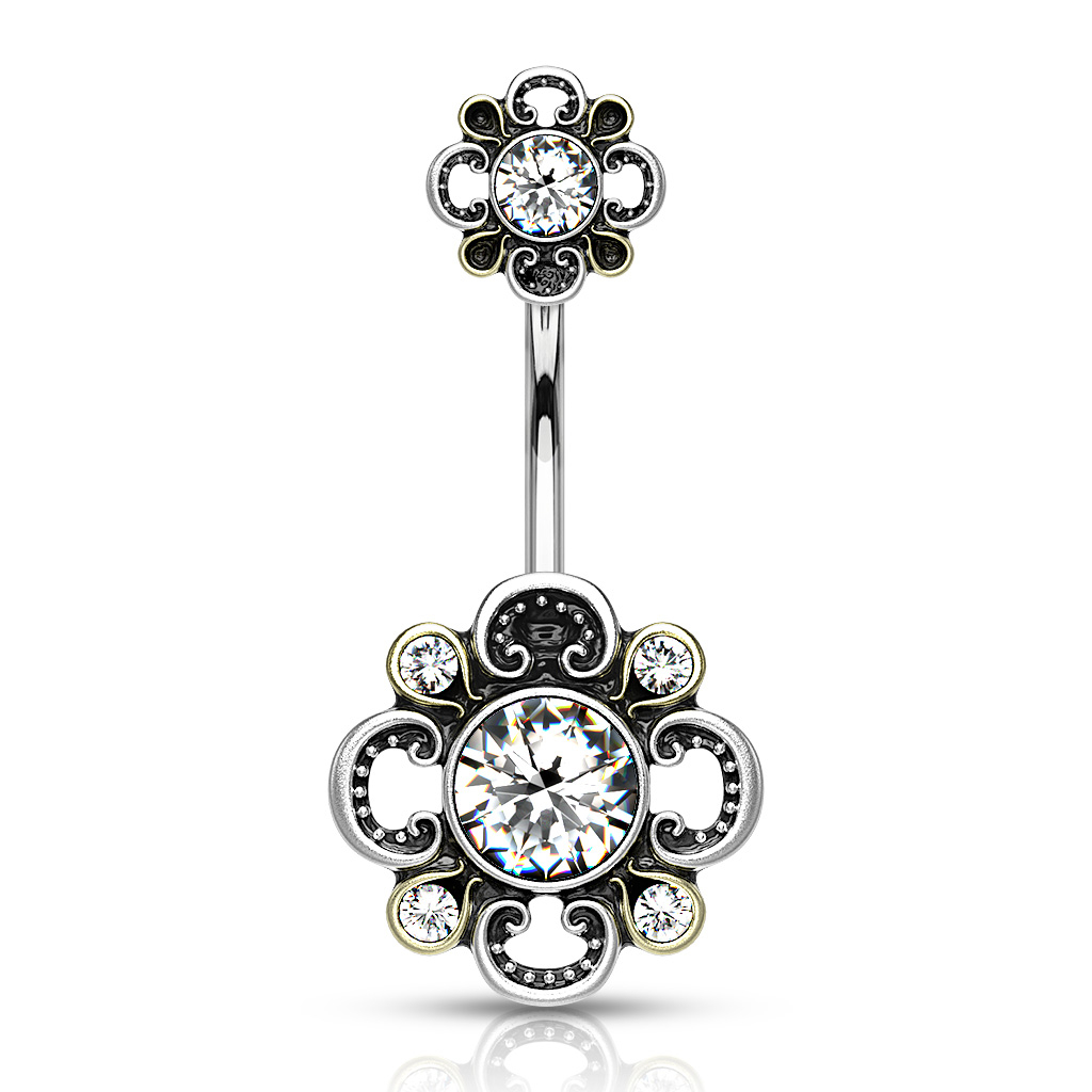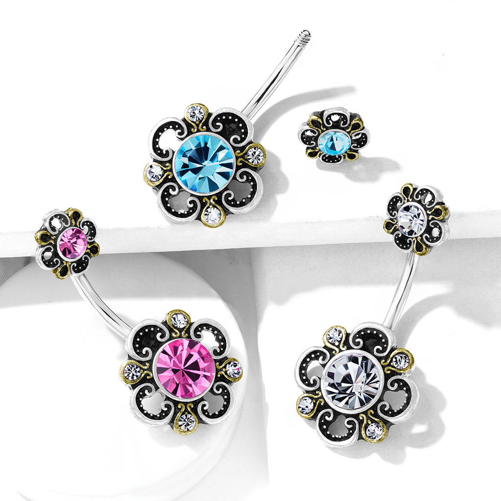 Jos pidät filigraani kuvioista ja etsit uutta korua napalävistykseesi, sinulla on mahdollisuus hankkia tämä uniikki napakoru antiikkisilla kukilla lävistykseesi. Korun filigraani kukka ei ole ainoastaan korun alaosassa, vaan myöskin yläpallon sijalla.