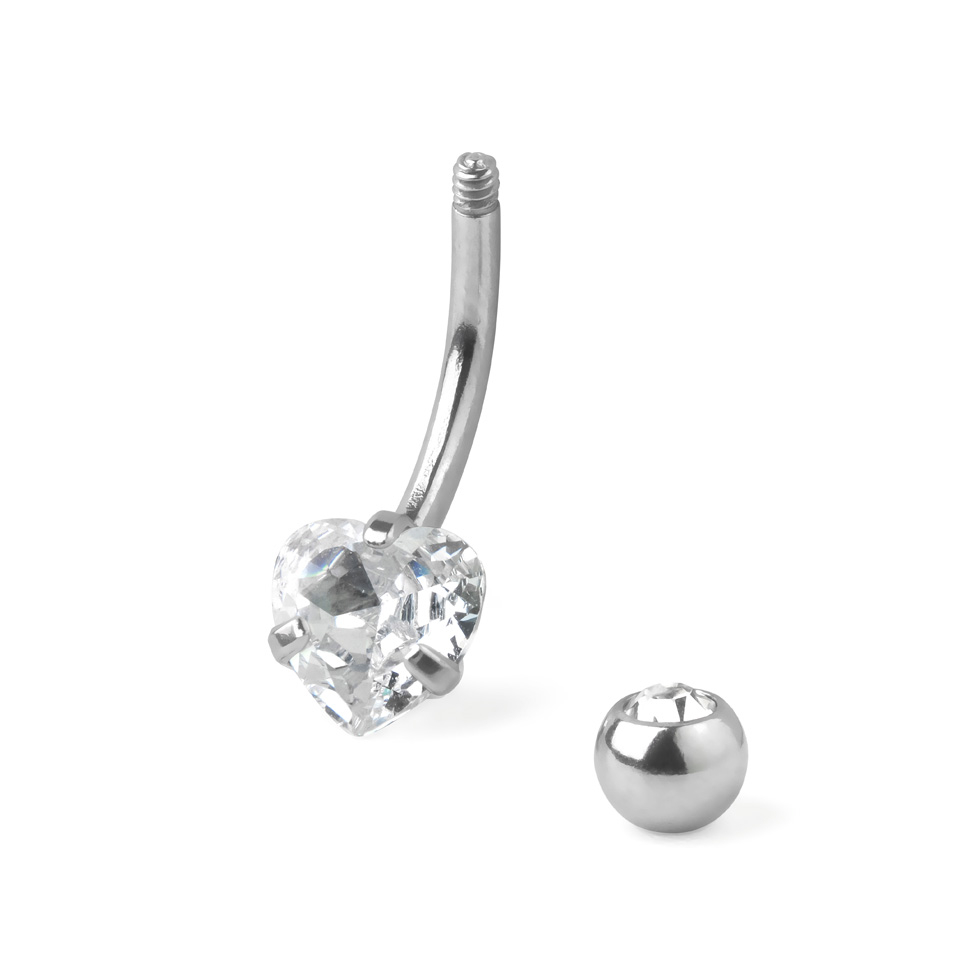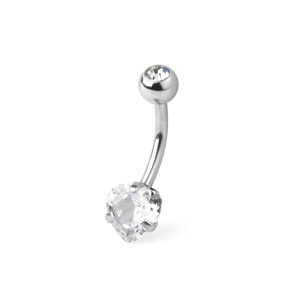 Korun ylempää palloa koristaa upotettu jalokivi ja alempi pallo on sydämen muotoinen jalokivi "prong-set" kiinnityksellä. Valitse korun jalokivien värin viidestä kauniista vaihtoehdosta. Koru on valmistettu kirurginteräksestä.