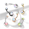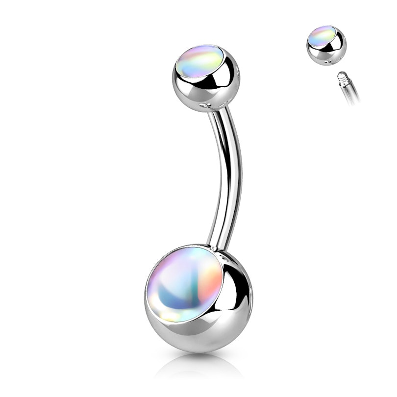 Tiedät miten saippuakuplat tai öljy veden pinnalla heijastaa värejä. Kiiltävä pinta, jonka värit muuttuvat sen liikkuessa on katseenvangitsija. Sama pätee tähän napakoruun, jonka molemmat kivet heijastavat värejä samalla tavalla. Kivien efektiä ei voida kuitenkaan tavoittaa kuvaan, vaan se on ainoastaan nähtävissä korua katsoessa. Eli kun käytät tätä napakorua lävistyksessäsi, korun kivien efekti on nähtävissä liikkeen aikana.
