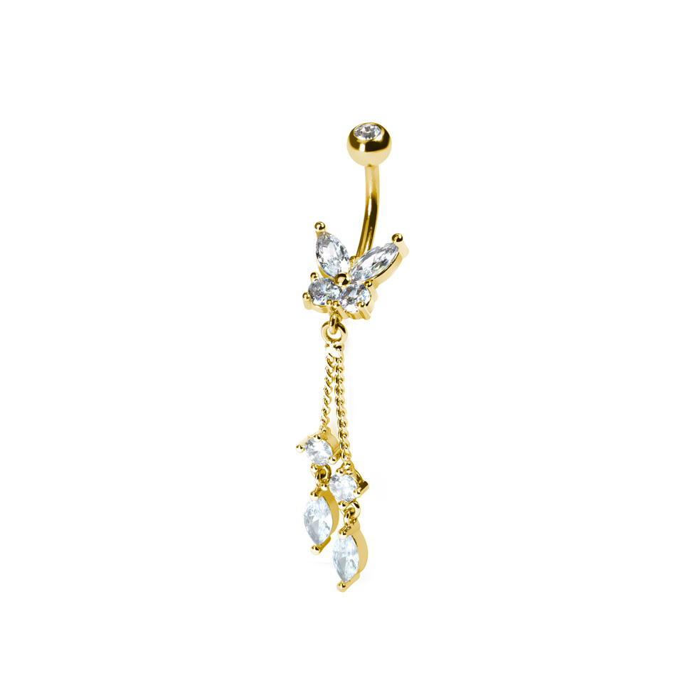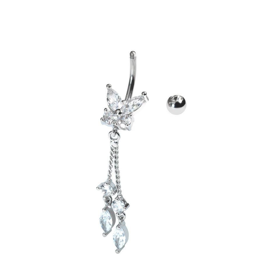 Tämä säihkyvä napakoru sisältää kauniin perhosen alemmassa renkaassa sekä lisää säihkyviä korukiviä, jotka kiinnittyvät perhoseen hienovaraisilla ketjuilla.