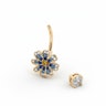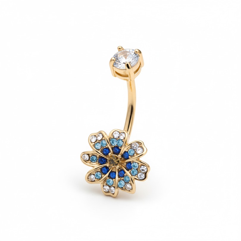 Tämä söpö napakorubarbelli on tehty napapaitakaudelle. Siinä on pieniä sinisen eri sävyisiä korukiviä, jotka muodostavat kukan, jonka keskiössä on keltainen korukivi. Ylemmässä kuulassa on kirkas kuula.