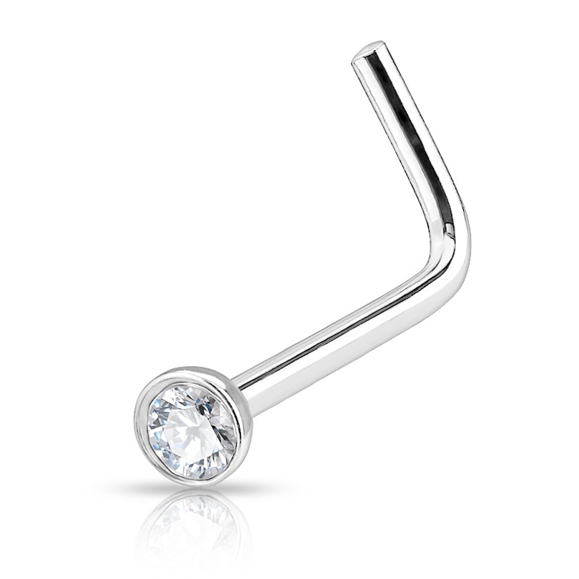 Taivutettu nenäkoru pysyy hyvin nenässä muotonsa vuoksi. 6mm pitkä tappi on saatavilla kahdella eri paksuudella, jotta koru pysyisi nenässä täydellisesti.