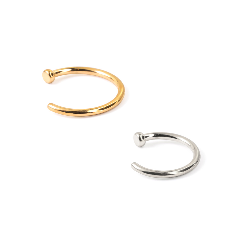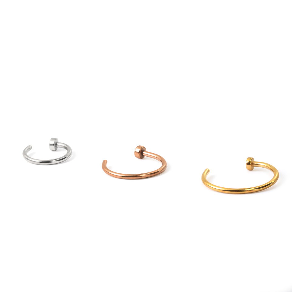 Nätti, ja hyvä materiaali, mutta itselleni kumpikin tilaamani koko oli liian suurta, jolloin vapaa pää näkyy, eikä näytä renkaalta. Itse olen hento, ja nenänseinämäni on tavallista ohuempi. Isompaa renkaista käytin korvassa, ja näytti kivalta siinäkin. Tykkään enemmän litteämmistä koruista, jotka eivät näy omaan näkökenttään. Eli tämä oli kokeilu, mutta kiva koru silti.