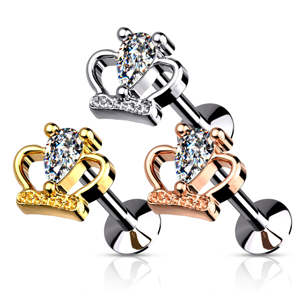 Tämän labretin päätä koristaa ihastuttava kruunu. Kruunu on saatavilla eri väreissä. Kaikissa malleissa on kuitenkin sama pituus, paksuus ja koristekiven väri. Kruunun keskiosaa koristaa ylösalaisin oleva pisaran muotoinen väritön kivi. Kruunun takana on pieni nuppi, joka painetaan tapin sisään. Tapissa ei siis ole kierteitä, johon koru ruuvataan. Jos kruunu on liian helppo ottaa tapista pois, voit taivuttaa nuppia hieman, jolloin se pysyy tiukemmin kiinni.