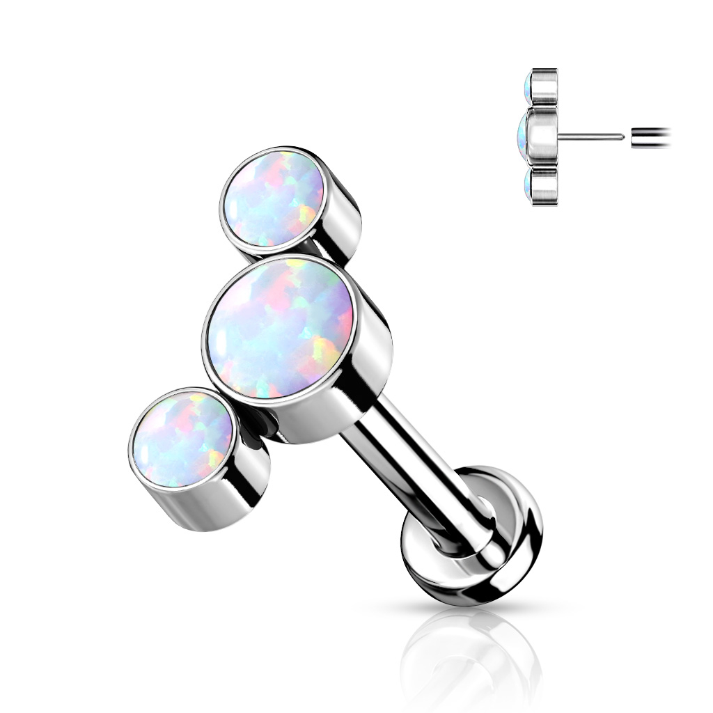 Push-in-labretissa ei ole kierteitä, vaan koru työnnetään tappiin suoraan. Voit valita korun kahden mallin väliltä, 3 tai 5 opaalikivellä. Lisäksi tarjolla on eri värejä kiville. Kivien koko vaihtelee. 3 opaalikiven mallissa kivien koot ovat 2,9 mm ja 3,8 mm. 5 opaalikiven mallissa koot ovat 1,9 mm, 3 mm ja 4 mm.