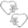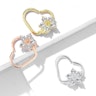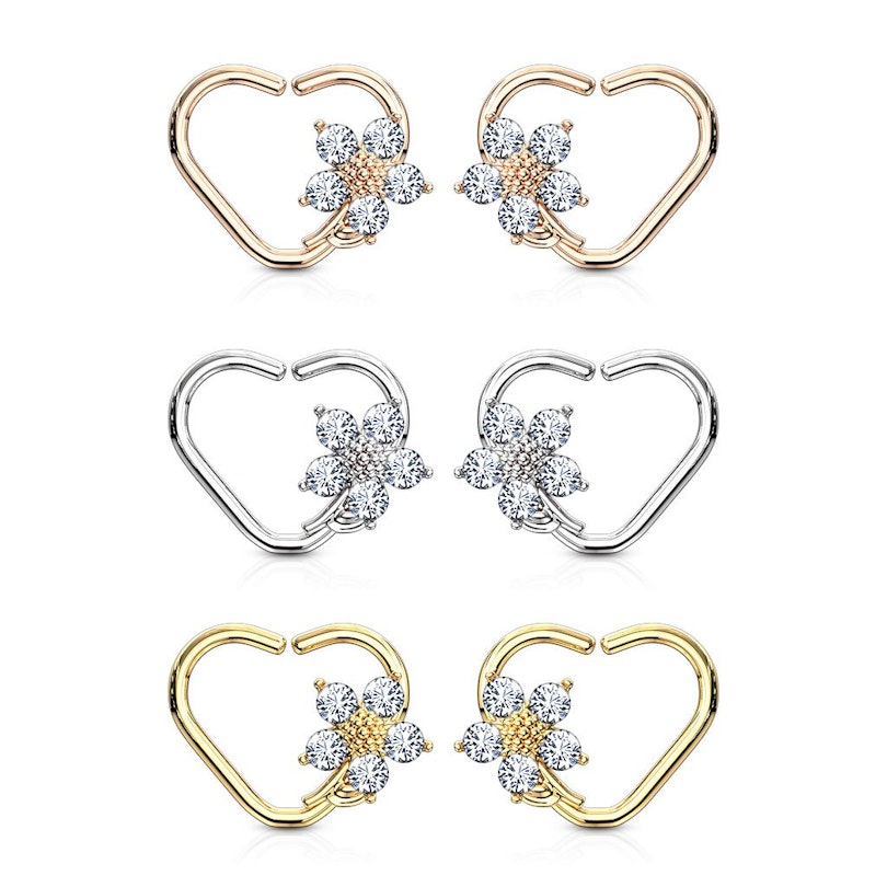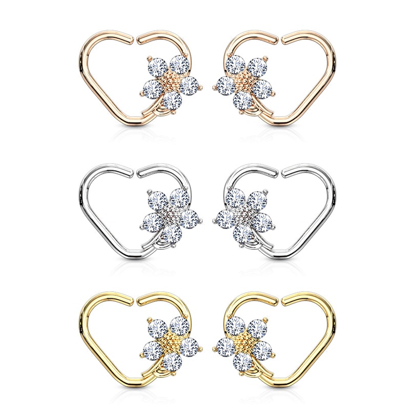 Sydämet ja kukat - ei voisi olla kauniimpaa yhdistelmää. Rengasta nimittäin koristaa molemmat näistä edellämainitsemista koristeista. Kuvassa näet sydämenmuotoisen renkaan, jossa on toisella puolella kaunis kukka. Ota huomioon se, että sinun täytyy valita samantien kumpaan korvaan aiot lävistysrenkaan laittaa, sillä kukka on vain toisella puolella korua.