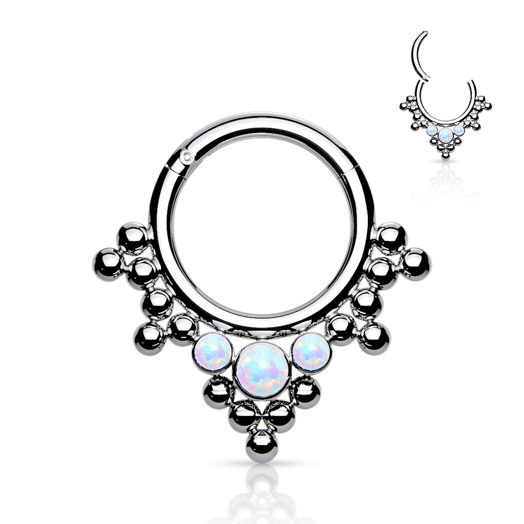 Tässä renkaassa on saranallinen lukitusmekanismi, joka on etu monella tapaa. Ensinnäkään sinun ei tarvitse näperrellä pienien pallojen kanssa, jotka voivat kadota jos pudotat ne esim. viemäriin. Toisekseen sen avaaminen ja sulkeminen on todella helppoa. Renkaan halkaisija on 8 mm ja sen tapin paksuus on 1.2 mm. Kokonsa puolesta rengas sopii useisiin lävistyksiin, kuten septumiin. Jos sinulla on muitakin samankokoisia lävistyksiä, voit ehdottomasti käyttää rengasta niihin. Rengas on titaanista, joten se soveltuu myös uusiin lävistyksiin.