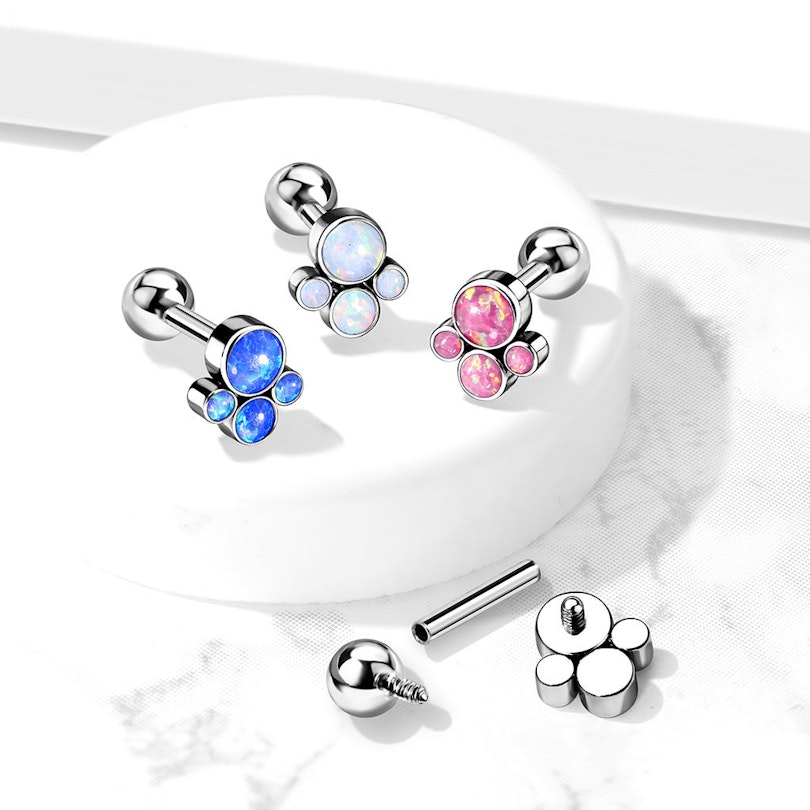 Korussa on myös sisäiset kierteet - yksi molemmissa päissä. Näin voit välttyä lävistyksen ihon raapimiselta, kun laitat korua. Koska korun molemmat päät voidaan irrottaa, voit myös halutessasi vaihtaa esim. pienemmän pallon koruun, jos 4 mm halkaisijan pallo on liian suuri sinulle. Koristeen voi myös laittaa toiseen koruun, mutta sinun tulee varmistaa että niiden kierteet sopivat yhteen. Korun etuosa koostuu pienistä opaalikivistä, jotka ovat synteettisiä opaalin jäljitelmiä. Erikokoiset opaalit on aseteltu symmetriseen kokonaisuuteen.