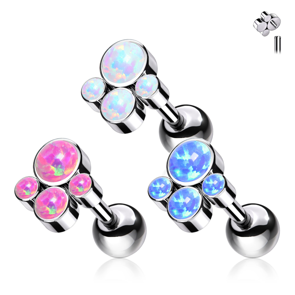 Korussa on myös sisäiset kierteet - yksi molemmissa päissä. Näin voit välttyä lävistyksen ihon raapimiselta, kun laitat korua. Koska korun molemmat päät voidaan irrottaa, voit myös halutessasi vaihtaa esim. pienemmän pallon koruun, jos 4 mm halkaisijan pallo on liian suuri sinulle. Koristeen voi myös laittaa toiseen koruun, mutta sinun tulee varmistaa että niiden kierteet sopivat yhteen. Korun etuosa koostuu pienistä opaalikivistä, jotka ovat synteettisiä opaalin jäljitelmiä. Erikokoiset opaalit on aseteltu symmetriseen kokonaisuuteen.