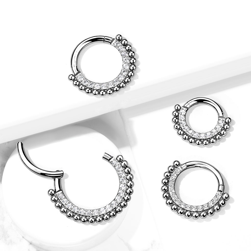 Titaani on yksi parhaimmista materiaaleista, jota voit valita lävistyksiin. Sen vuoksi titaanisia aloituskoruja käytetään usein uusiin lävistyksiin. Tavallisesti titaaniset korut ovat melko tylsiä, niissä ei ole korukiviä tai koristeita. Näin ei ole kuitenkaan tämän korun kohdalla, koska siinä on useita korukiviä ja pieniä pyöreitä helmiä renkaan ympärillä.