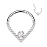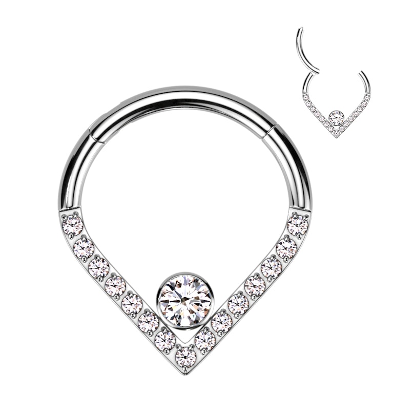 Tätä titaanista saranaregnasta määrittävät lukuisin korukivin muodostettu V-muoto ja suuri korukivi designin sisäosassa. Koru on todellinen katseenvangitsija lisättäväksi kokoelmaasi ja pidettäväksi erioistilaisuuksissa tai vain antamaan mille tahansa asulle loistokkuutta.