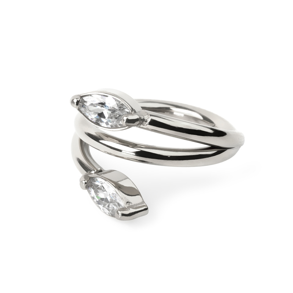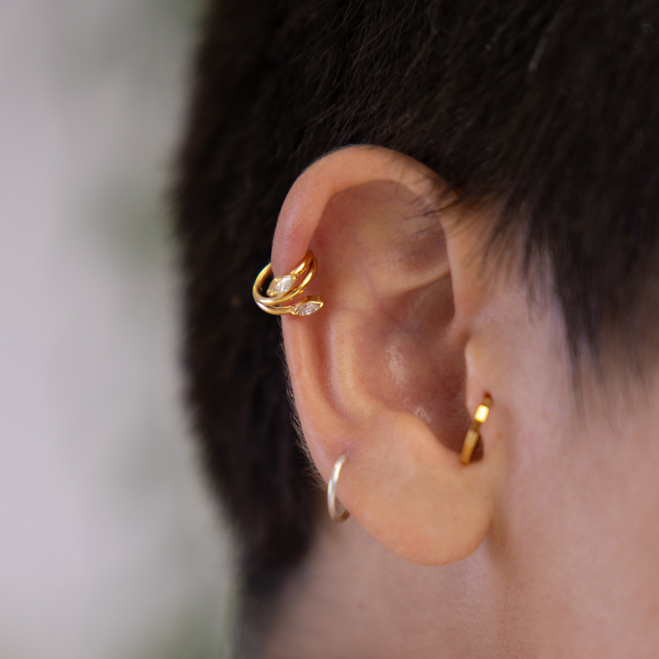 Herkkä kirurginteräksinen segmenttirengas, jota koristaa kaksi markiisi-hiottua zirkoniakiveä, kuin lehdet köynnöksessä. Saatavilla joko 8 tai 10 mm:n halkaisijalla ja kulta- tai hopeapinnoitteella. Tämä monipuolinen koru sopii kauniisti kaikenlaisiin korvalävistyksiin, erityisesti rustolävistyksiin, kuten rook tai helix.