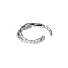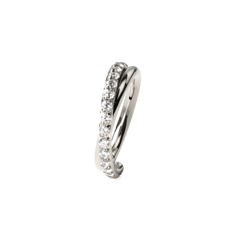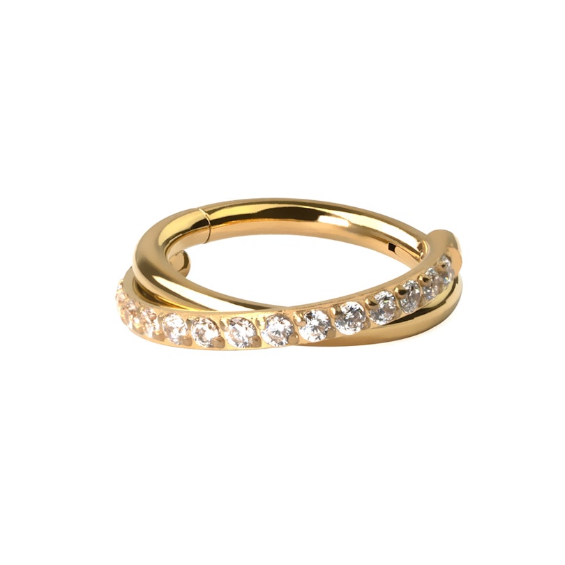 Tämä rengas on sekä kaunis että käytännöllinen. Renkaan saranallinen lukitusmekanismi tekee korun asettamisesta nopeaa ja helppoa. Sinun tulee vain vetää korun saranallinen osa ylöspäin, asettaa rengas lävistykseesi ja sulkea se, kunnes osa napsahtaa paikalleen. Renkaan kimalteleva crossover-design on täydellinen, jos haluat lisätä tyylikästä säteilyä esim. helix-, daith-, rook- tai korvalehtilävistykseesi.