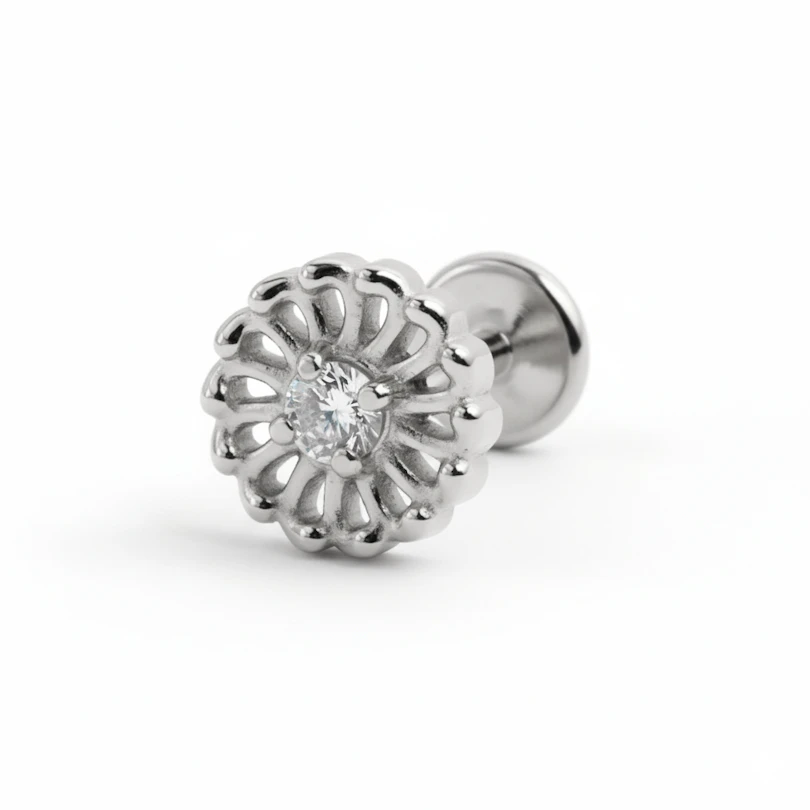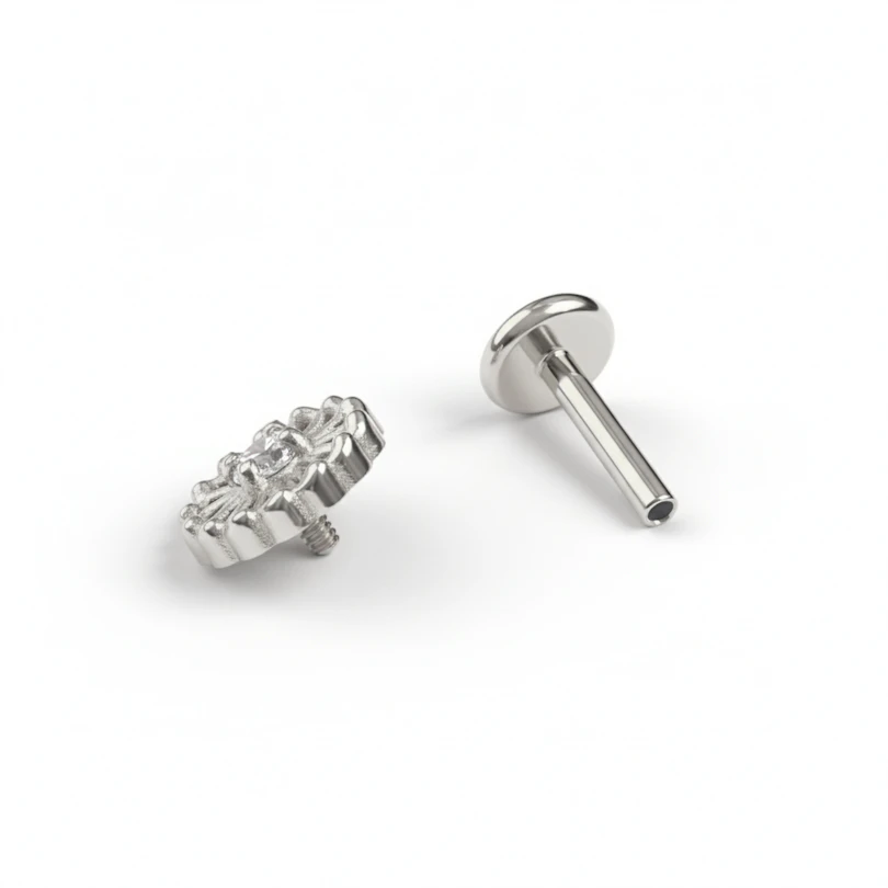 Titaanista valmistettu koru on hypoallergeeninen, vedenkestävä ja riittävän luja päivittäiseenkin käyttöön. Sisäkierre tekee asettelusta sulavan ja istuvuudesta varman, joten koru pysyy juuri siellä missä pitää. Koru on suunniteltu flatback-takaosalla ja käytettäväksi conch-, helix-, korvalehti- ja tragus-lävistyksiin.