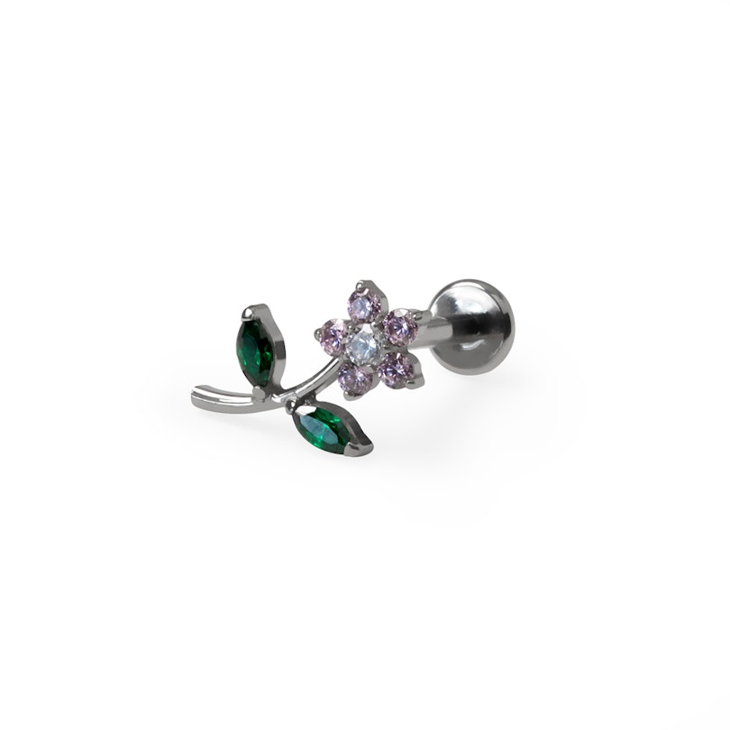 Tämä söpö kukka flat back -labret tuo ripauksen kevättä korvakorupinoosi. Kruunuistutettu kukka vihreillä lehtikoristeilla tasapainoilee leikkisän ilmeen ja jokapäiväisen mukavuuden kanssa. Valmistettu 316L-kirurginteräksestä, se on luja, vedenkestävä ja sopii useimmille ihotyypeille.