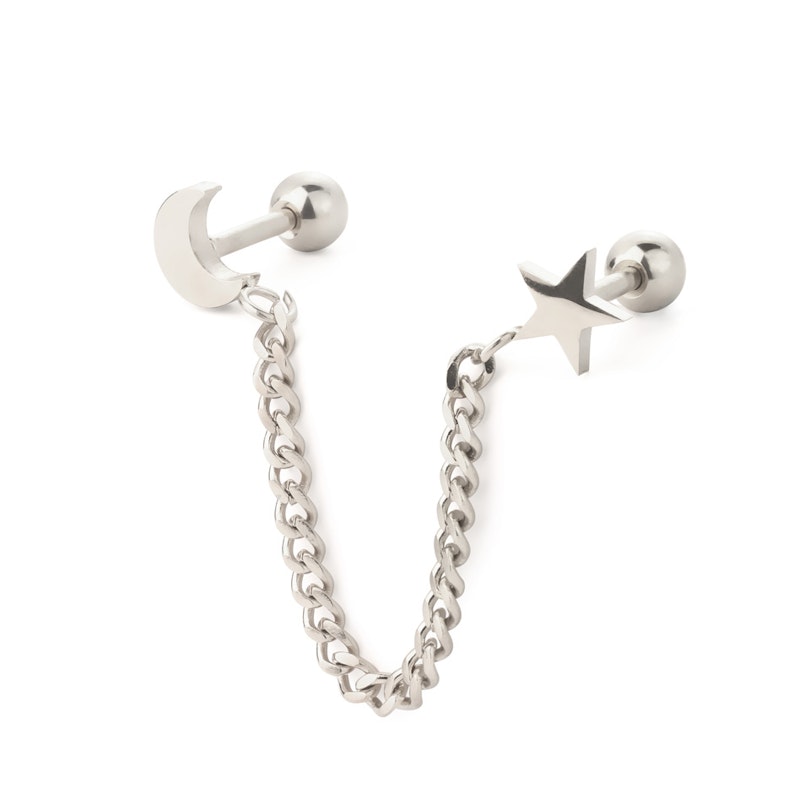 Jos sinulla on kaksi lävistystä korvassasi, voit hankkia tämän upean korun yhdistämään ne. Huomioi kuitenkin korun koon sopivuus lävistyksiisi. Barbellejä yhdistävän ketjun pituus on 4 cm. Molemmat barbellit ovat 1,2 mm paksuja ja 6 mm pitkiä. Niiden takaosassa on 4 mm lukituspallo. Etuosissa on koristeena tähti ja kuu.