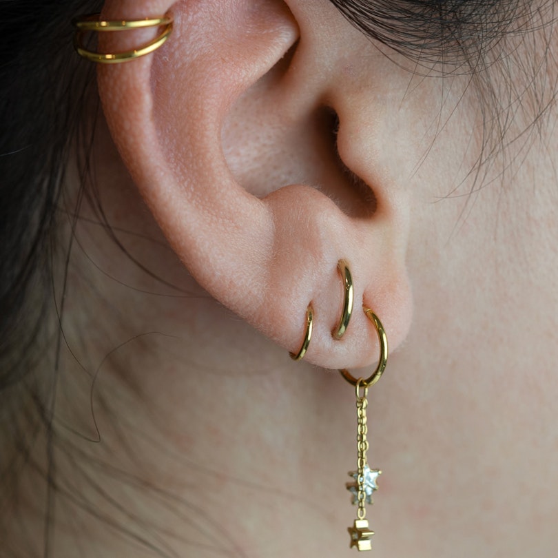 Kolme tähteä, kolme ketjua, paljon tyyliä. Tämä titaaninen kolmen tähden riipus lisää kevyttä liikettä ja ripauksen persoonaa korupinoosi. Kolme ketjua roikkuu yhdestä renkaasta, ja jokaisen päässä on tynnyri-istutettu kirkas kivi, joka keinahtelee juuri sopivasti.