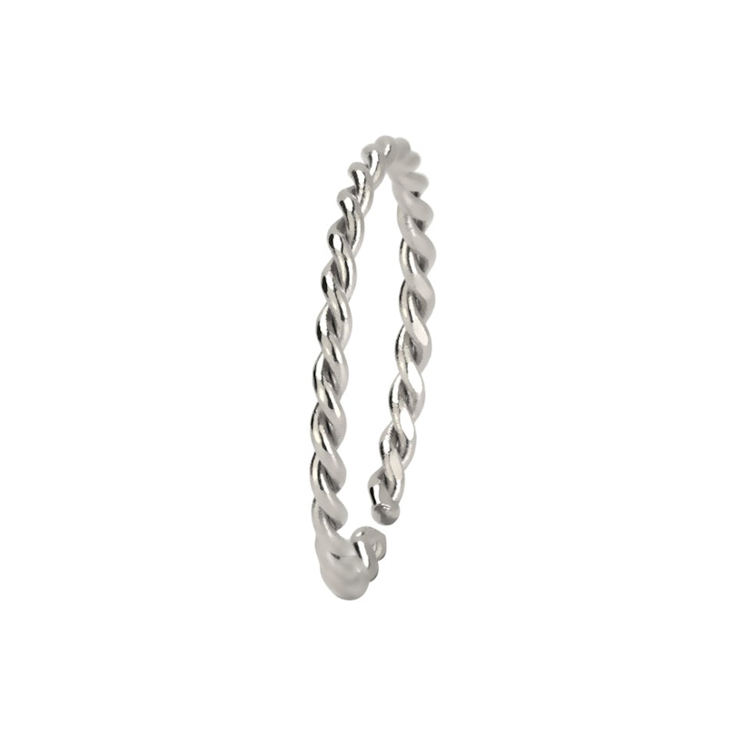 Tämä on erilainen versio taivutettavasta renkaasta, joka normaalisti koostuu yhdestä metallinpalasta. Tässä kaksi metallinpalaa on kierretty toistensa ympärille, luoden kauniin nyöritetyn ilmeen. Päädyt on hitsattu ja pyöristetty niin, että korun asettaminen lävistykseen onnistuu mukavasti eivätkä osat irtoa toisistaan.