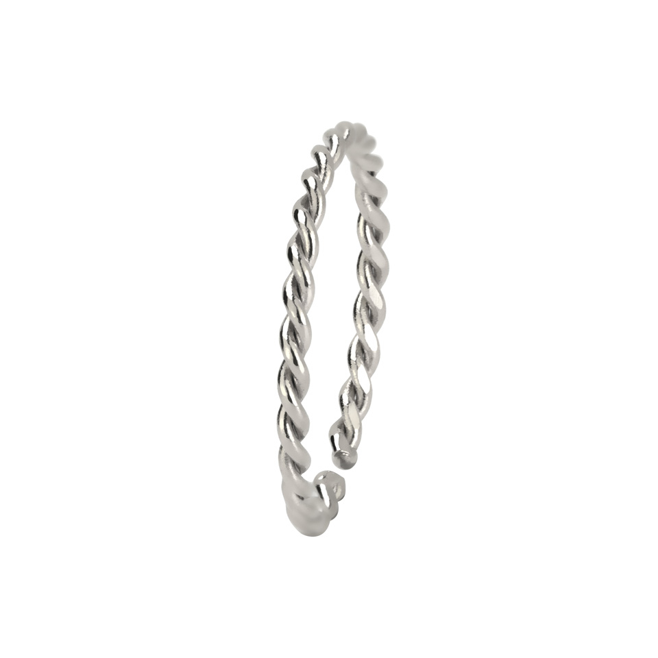 Tämä on erilainen versio taivutettavasta renkaasta, joka normaalisti koostuu yhdestä metallinpalasta. Tässä kaksi metallinpalaa on kierretty toistensa ympärille, luoden kauniin nyöritetyn ilmeen. Päädyt on hitsattu ja pyöristetty niin, että korun asettaminen lävistykseen onnistuu mukavasti eivätkä osat irtoa toisistaan.