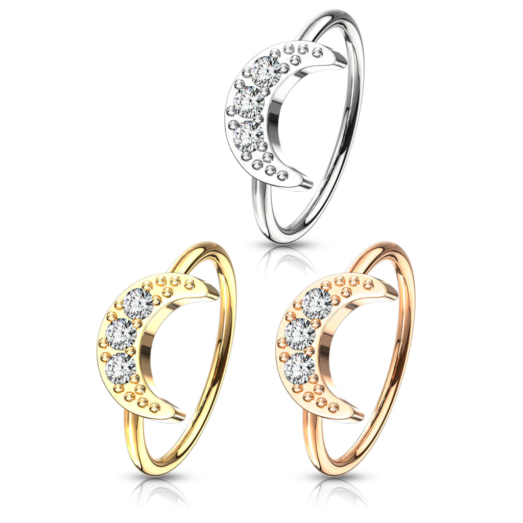 Kirurginteräksisen taivutettavan renkaan kuunsirppiä koristaa kolme väritöntä korukiveä, joita ympäröivät pienet nastakoristeet.