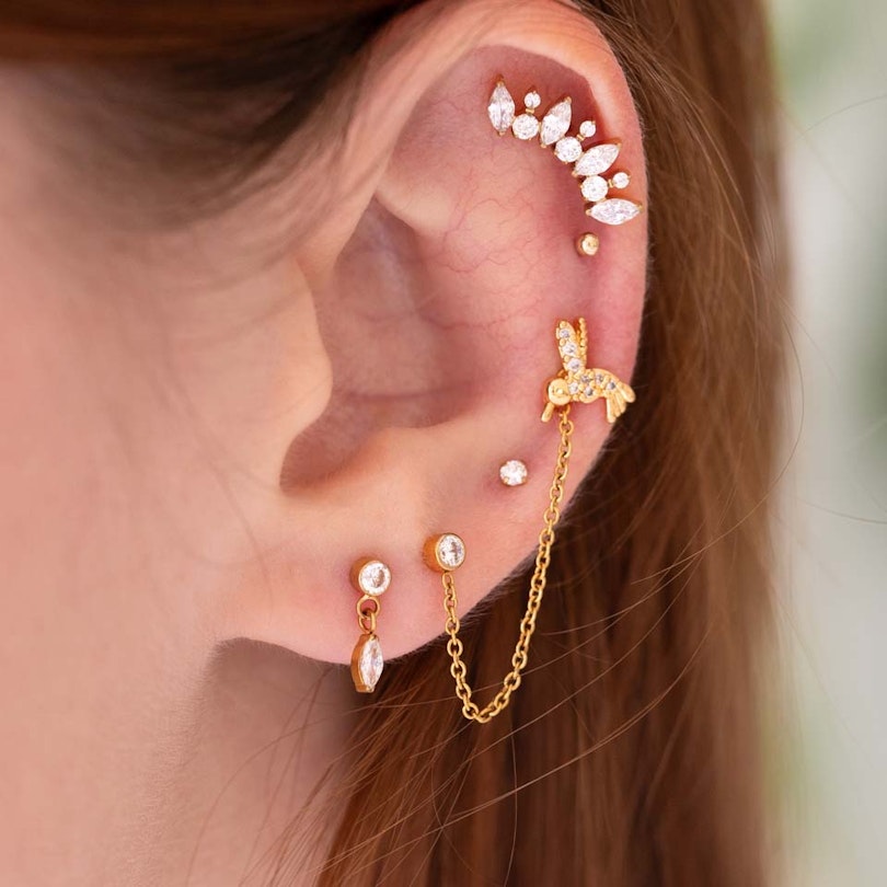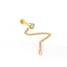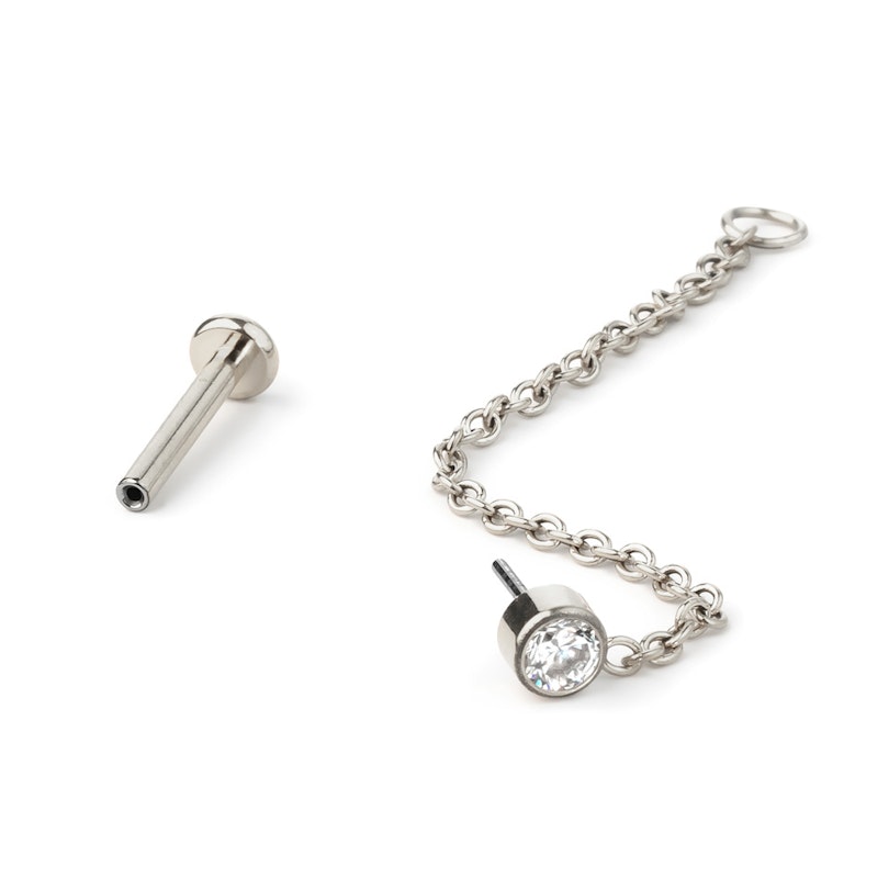 Tätä yksinkertaista labrettia koristaa tynnyri-istutettu korukivi ja sen pohjaan kiinnitetty ketju. Ketjun toisessa päässä on lenkki, jonka avulla voit kiinnittää sen joko toiseen korvakoruun tai saman labretin takaosaan niin, että se kiertää korvasi ylitse.