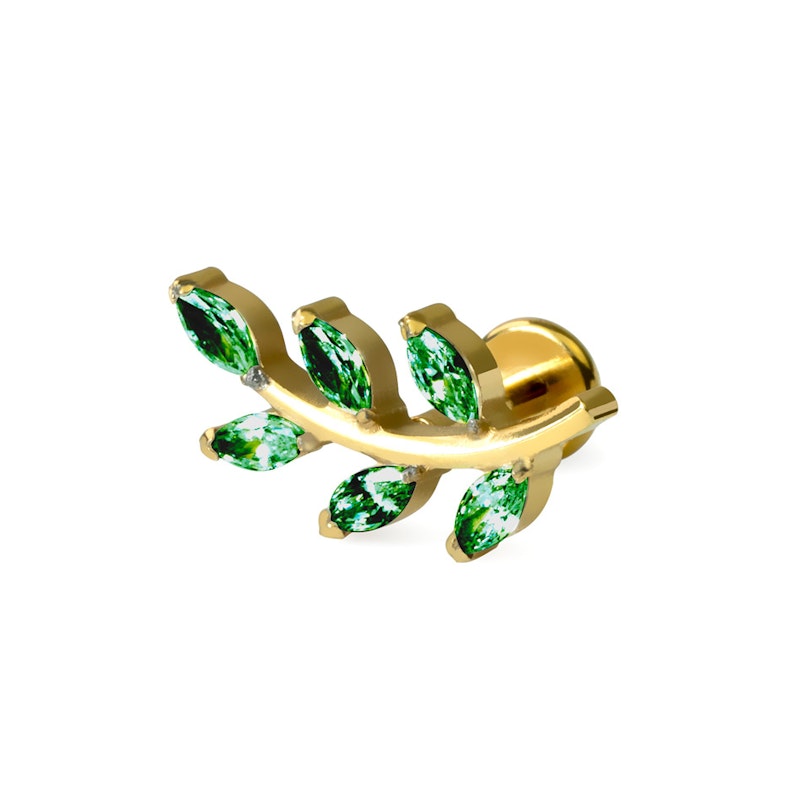 Ensiluokkainen kuudella markiisihiotulla kivellä koristeltu lehden muotoinen labret. Kivien väriksi valittavissa joko vihreä tai läpinäkyvä. Korun pinta joko hopea tai kultainen. Tyylikäs lisä korvakorukokoelmaasi.