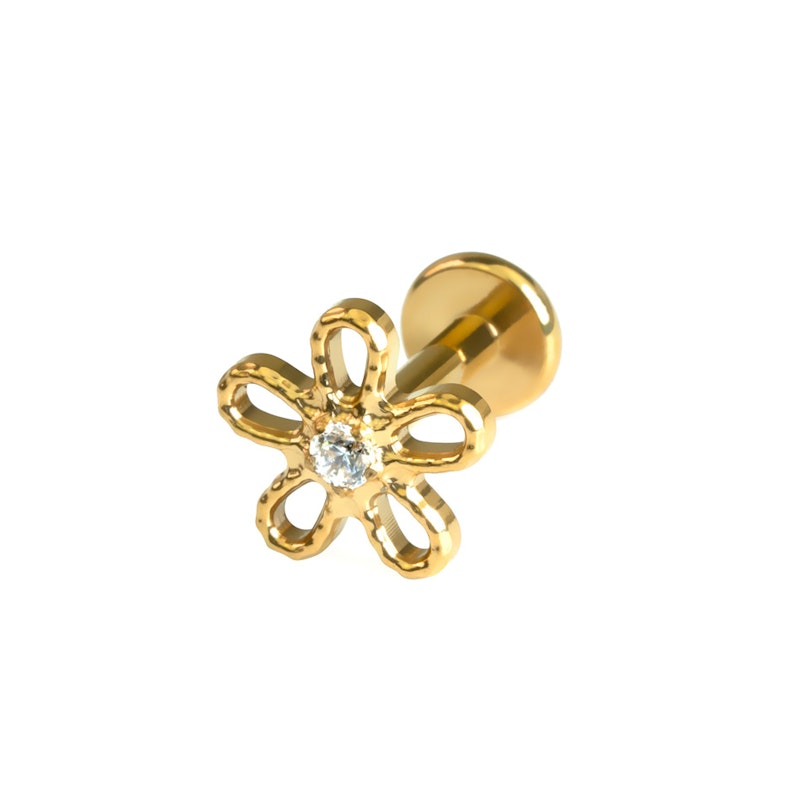 Ihastuttava päivänkakkaran muotoinen labrettimme kimaltaa keskelle istutetun zirkoniakiven ansiosta. Sisäkierteisen tapin omaavana koruna se on helppokäyttöinen; sujauta vain sileä tappi lävistykseen ja ruuvaa koristeosa paikalleen. Valmistettu hypoallergeenisesta titaanista, eli se on ihanteellinen herkälle iholle. Saatavilla kulta- tai hopeapinnoitteella, ja myös pituuden voit valita itse, jotta se sopisi varmasti lävistykseesi. Lisää olemukseesi herttainen päivänkakkara.
